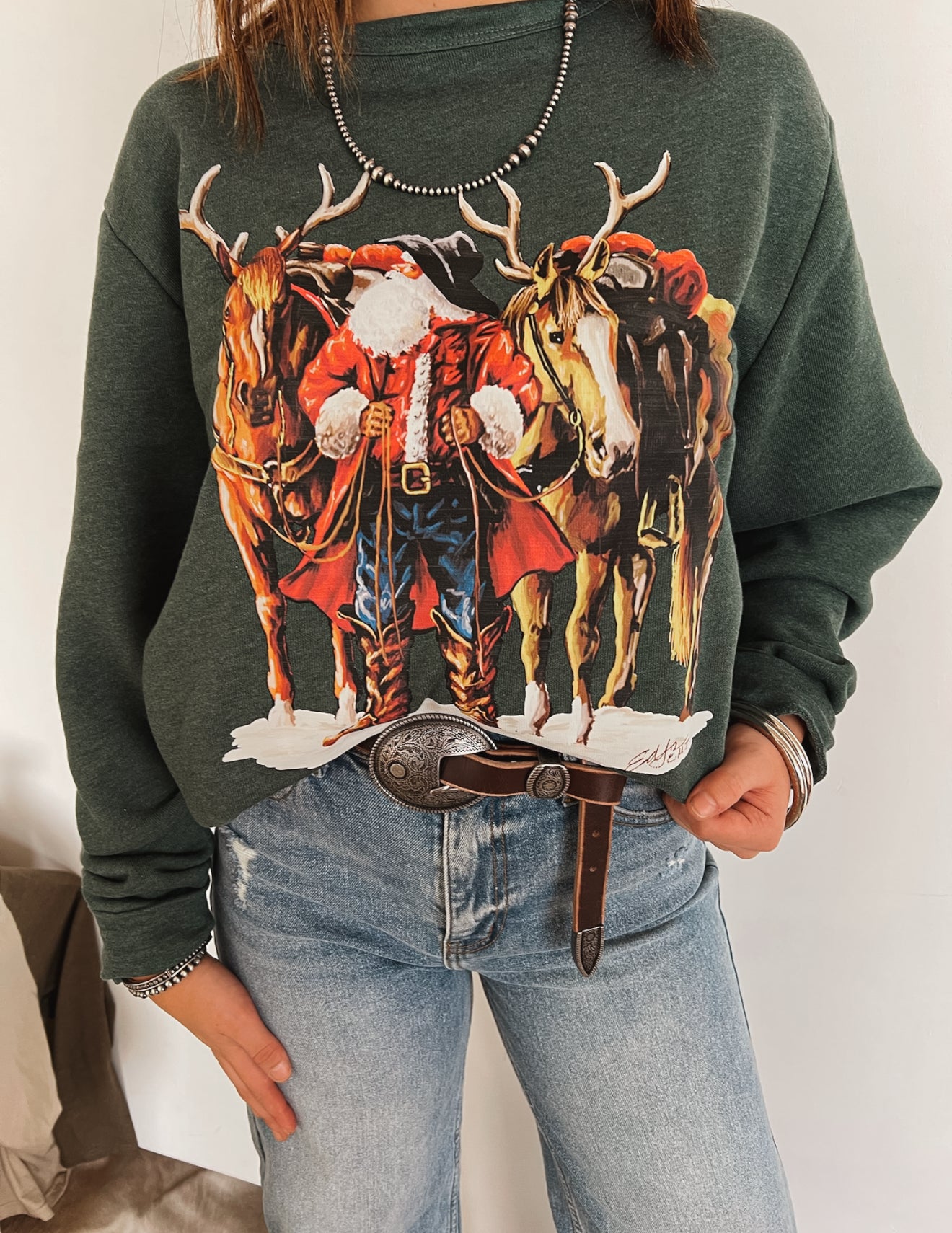 Cowboy Santa & His Reindeer Horses Tee or Sweatshirt (Heather Green)