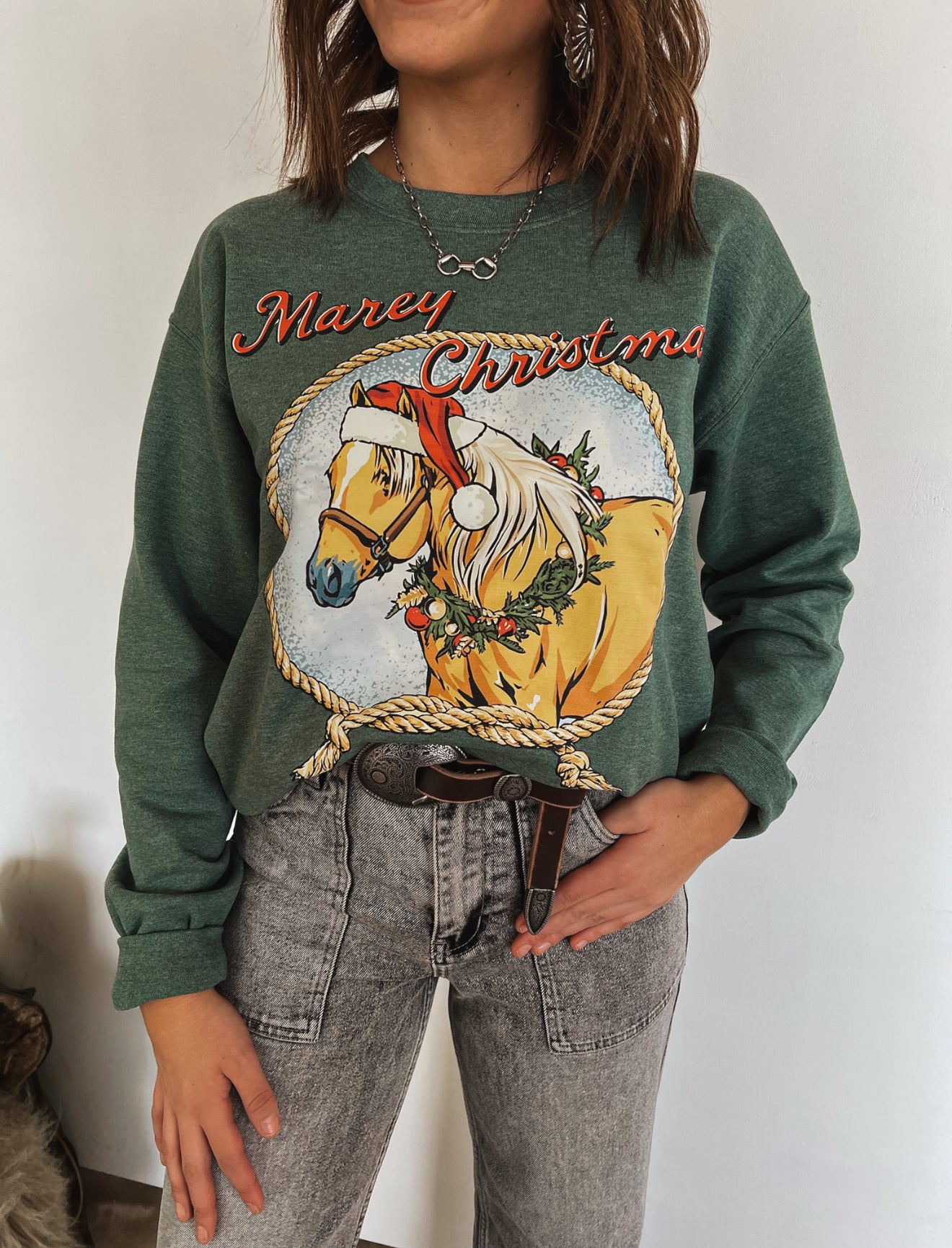 A Western holiday favorite with a fresh seasonal twist. This “Marey Christmas” design features a beautifully illustrated palomino mare dressed in her Santa hat and festive wreath, framed inside a rustic rope loop for the perfect ranch-raised Christmas look. The warm tones of the artwork pop beautifully against the deep heather green, giving it a cozy, woodsy, true-to-the-West feel.
