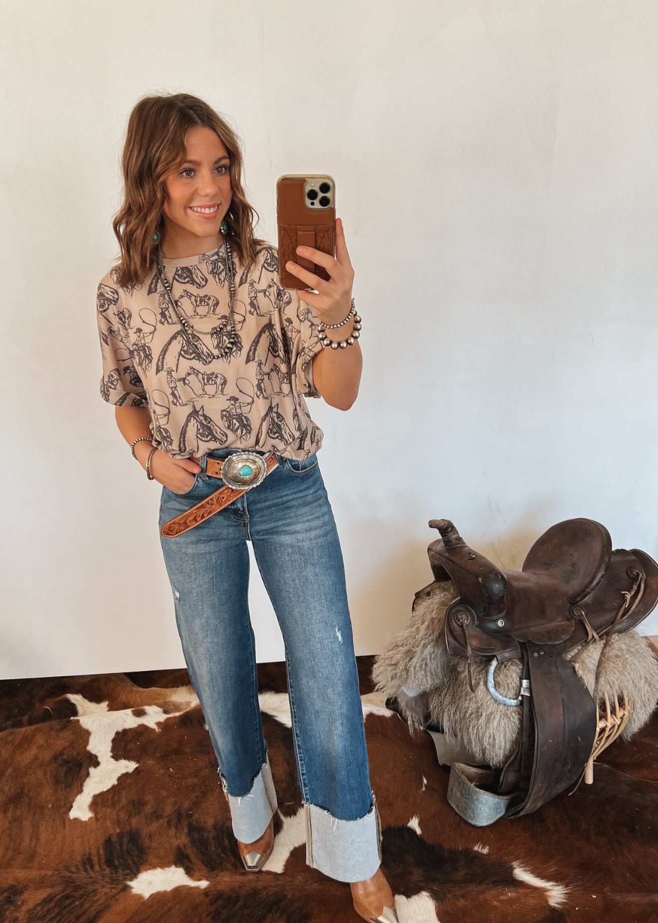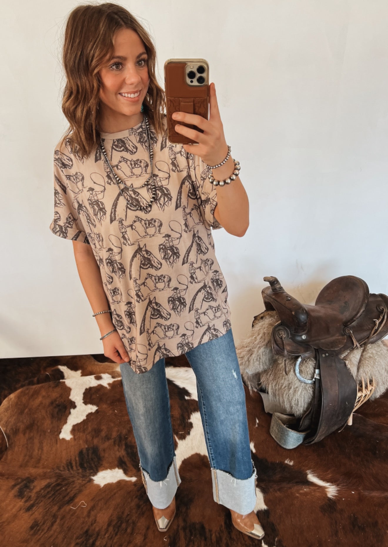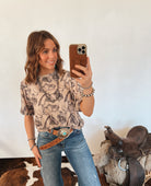 For the cowgirl who lives and breathes the western spirit — the Way of Life Tee is your everyday staple with a touch of rodeo soul. Featuring an allover hand-drawn horse and cowboy print, this relaxed-fit tee combines comfort with effortless style. Crafted from a soft cotton-poly blend, it’s lightweight, breathable, and perfect for layering under your favorite denim jacket or fringe vest.