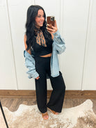 Effortless, edgy, and made to move with you. This black ribbed matching set is all about comfort with a side of cowgirl cool. Soft, stretchy fabric hugs in all the right places, while the sleek silhouette keeps things chic from sunup to sundown. Whether you’re hitting the town or lounging between rodeos, this set was made for the Western babe who does it all—and looks good doing it.