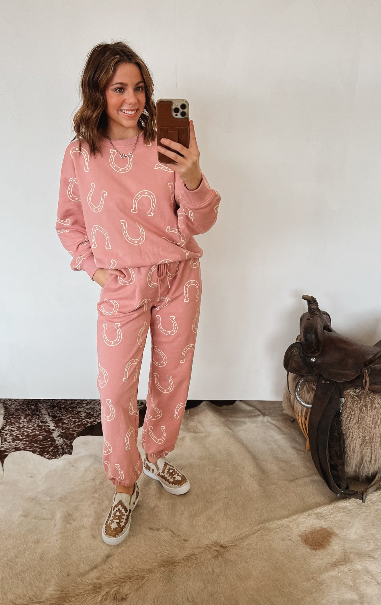 Add a little luck (and a lot of comfort) to your day with the Lucky Horseshoe Jogger Set. This soft blush-pink set features a playful horseshoe print that’s as charming as it is cozy. Made from a breathable cotton blend, the relaxed-fit sweatshirt and joggers are perfect for lounging, coffee runs, or casual weekend adventures. Effortlessly stylish and irresistibly soft — this set is your new go-to for good vibes and easy comfort.