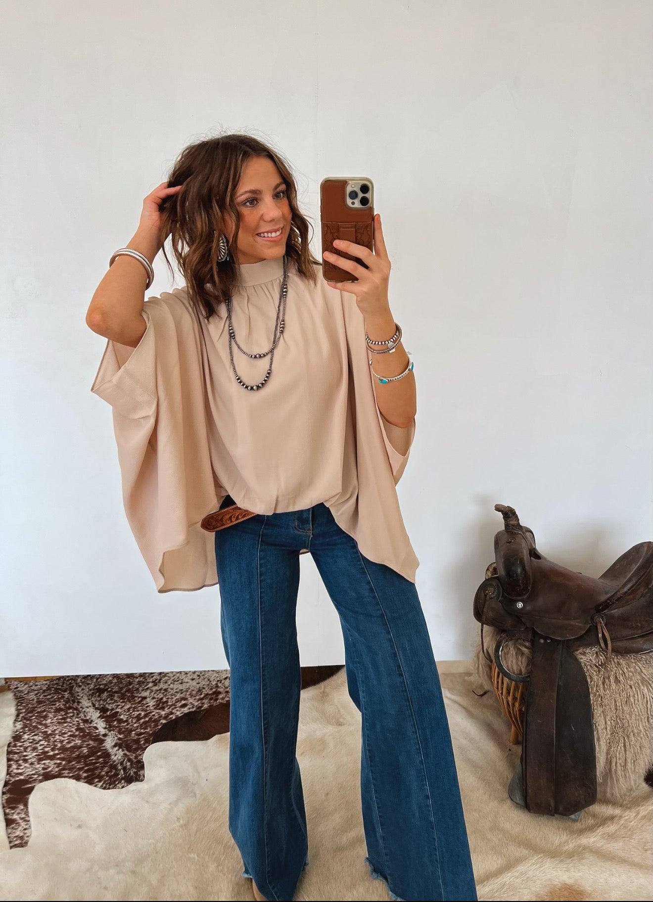 Effortless sophistication meets western flair in the Black Betty Mock Neck Top. This flowy, high-neck blouse features soft, draping sleeves and a relaxed silhouette that moves beautifully with you. Made from a silky polyester-spandex blend, it offers just the right amount of stretch and structure for a flattering fit that’s as comfortable as it is chic.