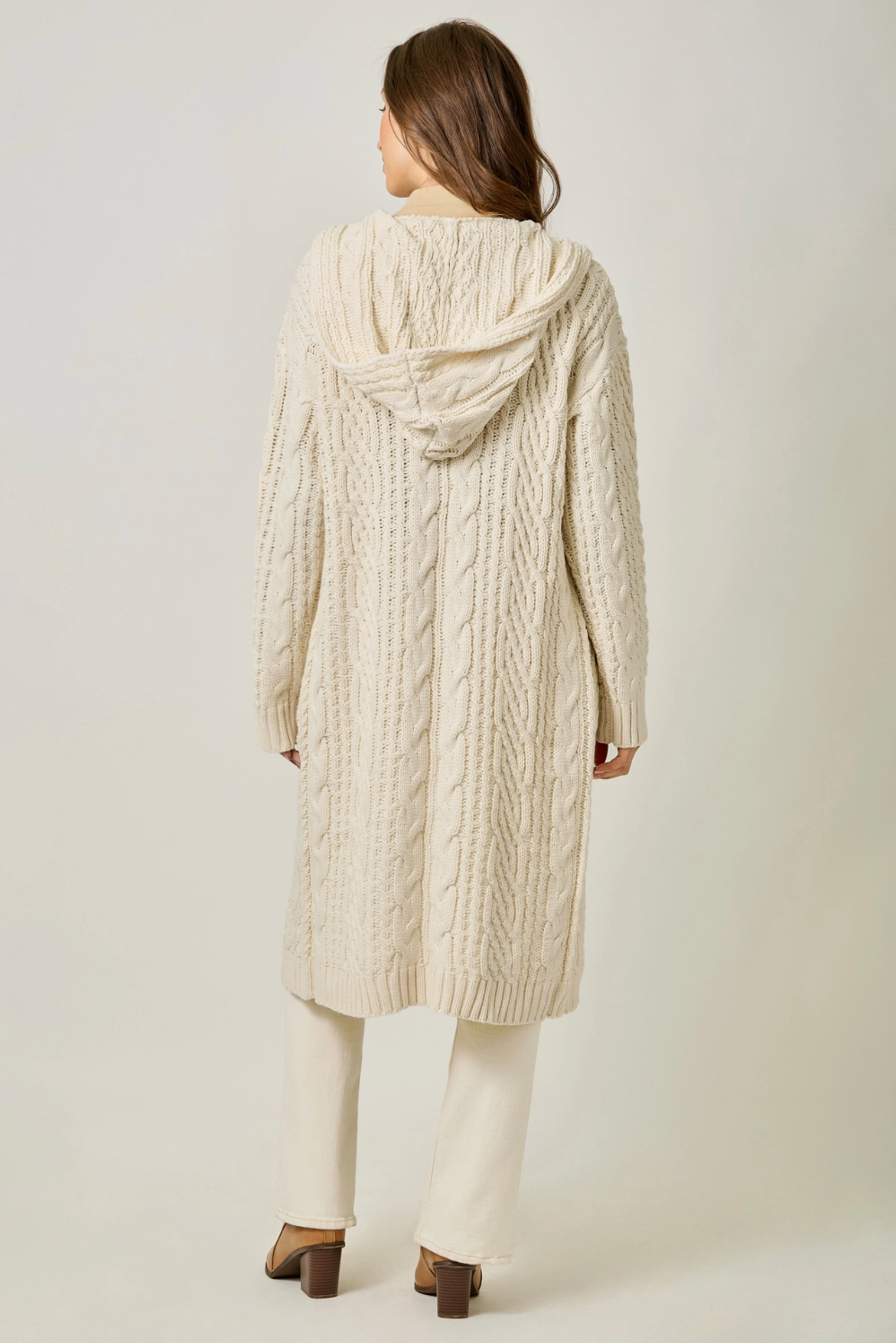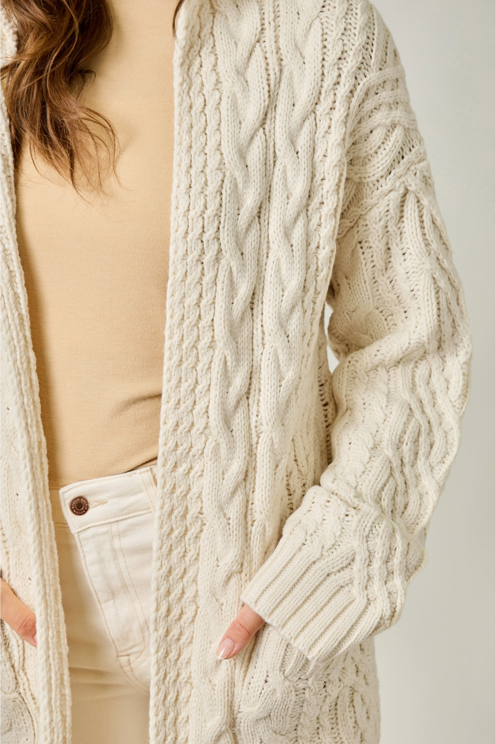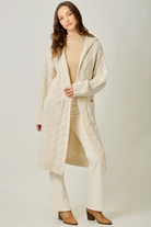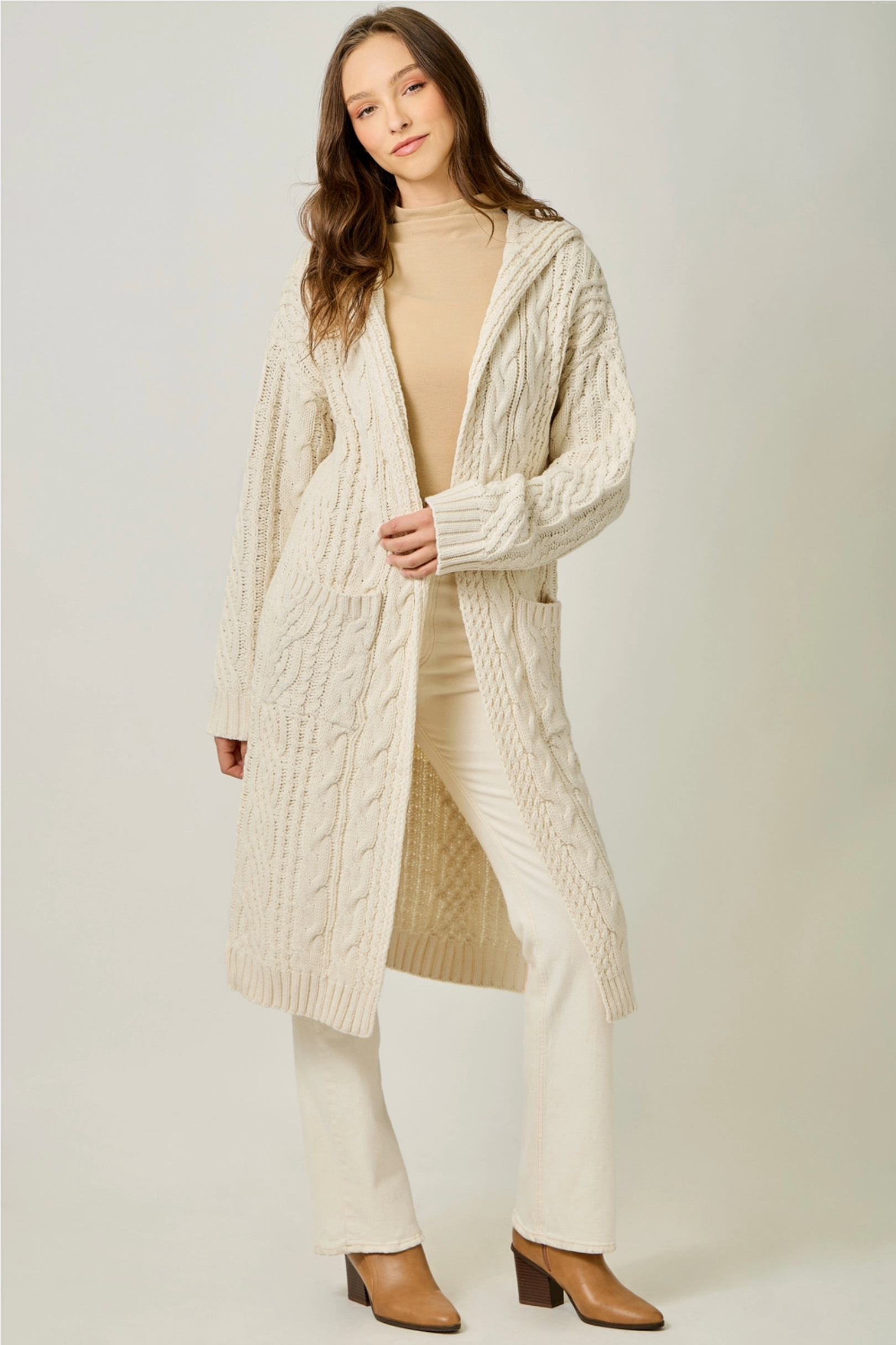Cozy, classic, and made for winter days — the Winter Wonderland Sweater Cardigan wraps you in warmth with timeless cable-knit texture from top to hem. This dreamy open-front silhouette features a relaxed drape, roomy front pockets, and a soft hood for an extra touch of comfort. The midi length gives it that effortless, bundled-up look — perfect for layering over basics, denim, or holiday outfits.