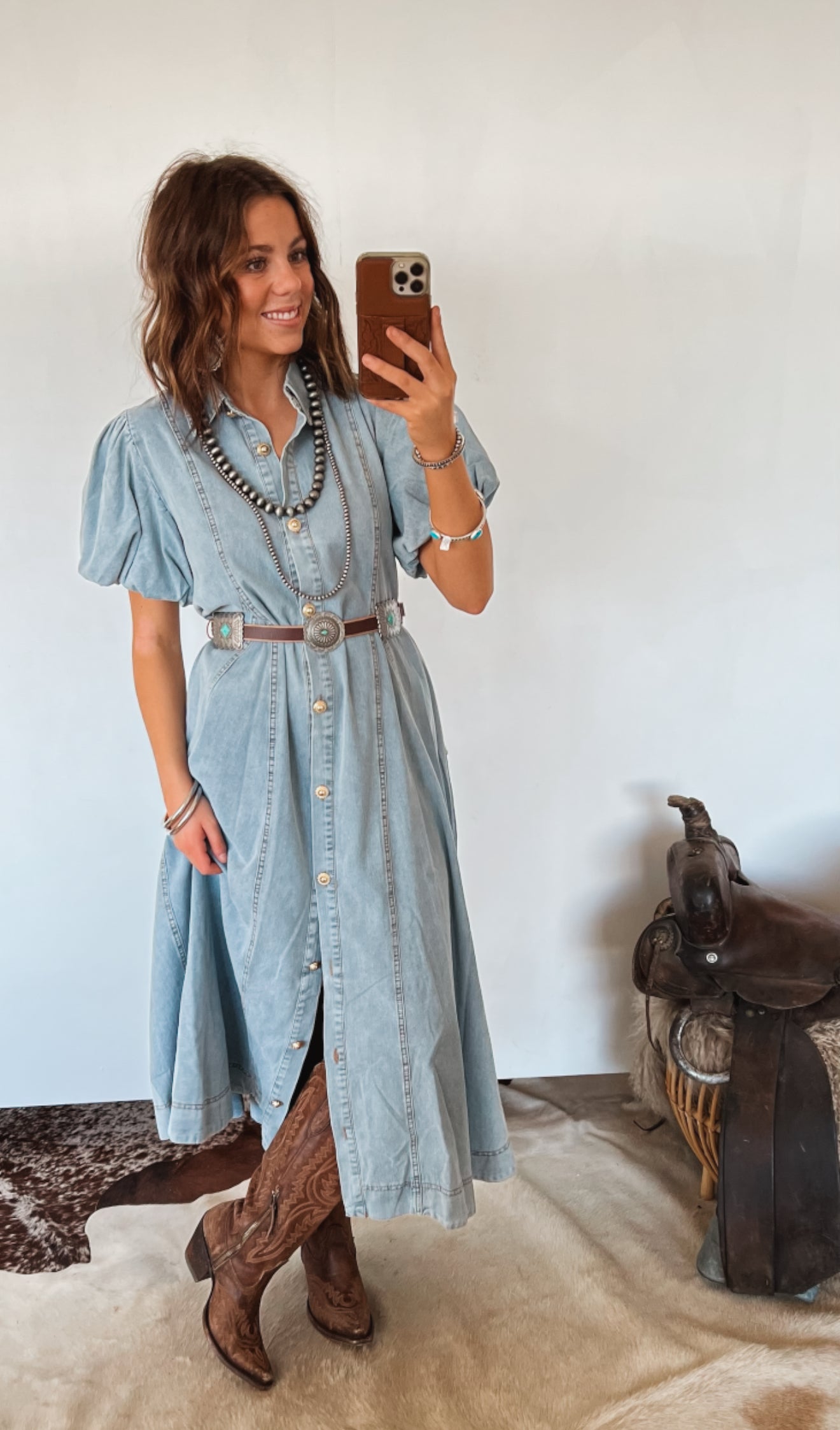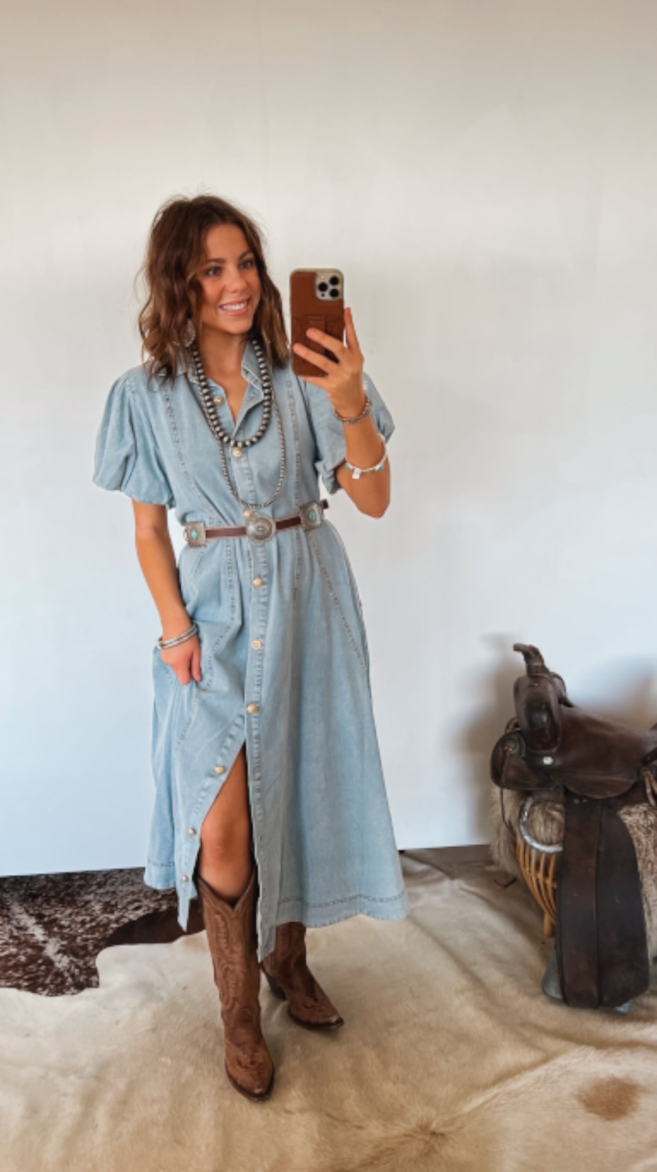 Classic denim meets holiday charm in the Christmas At The Ranch Denim Dress. This button-front midi is designed with a soft, drapey denim that moves beautifully while still giving you that true western feel. The puff sleeves add a feminine touch, while the full skirt and front slit keep it flirty, fun, and easy to dance in all night long.