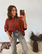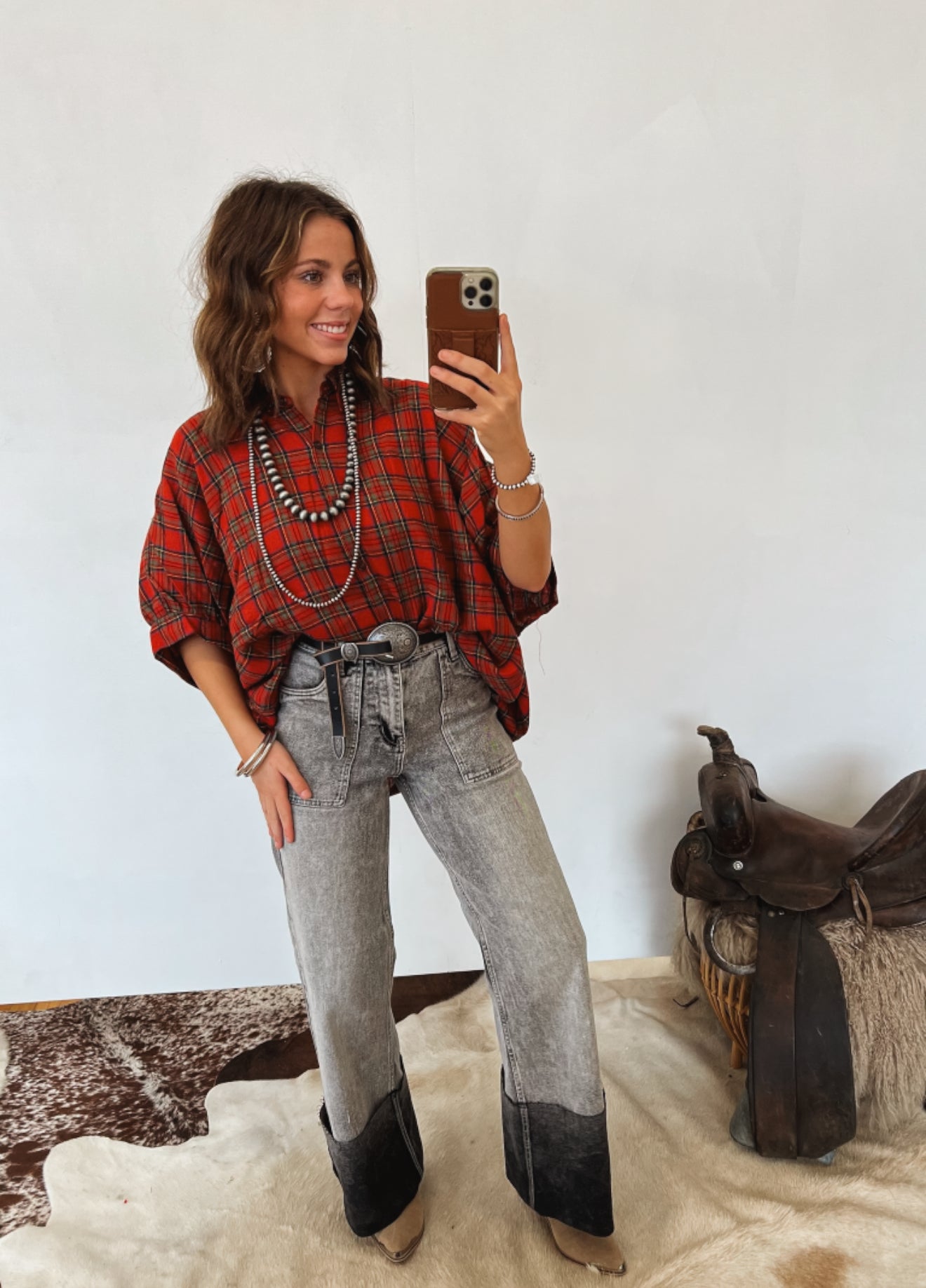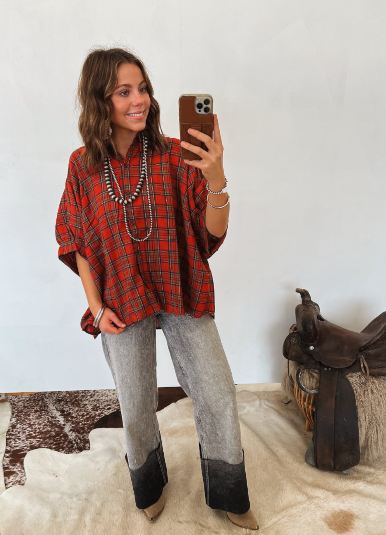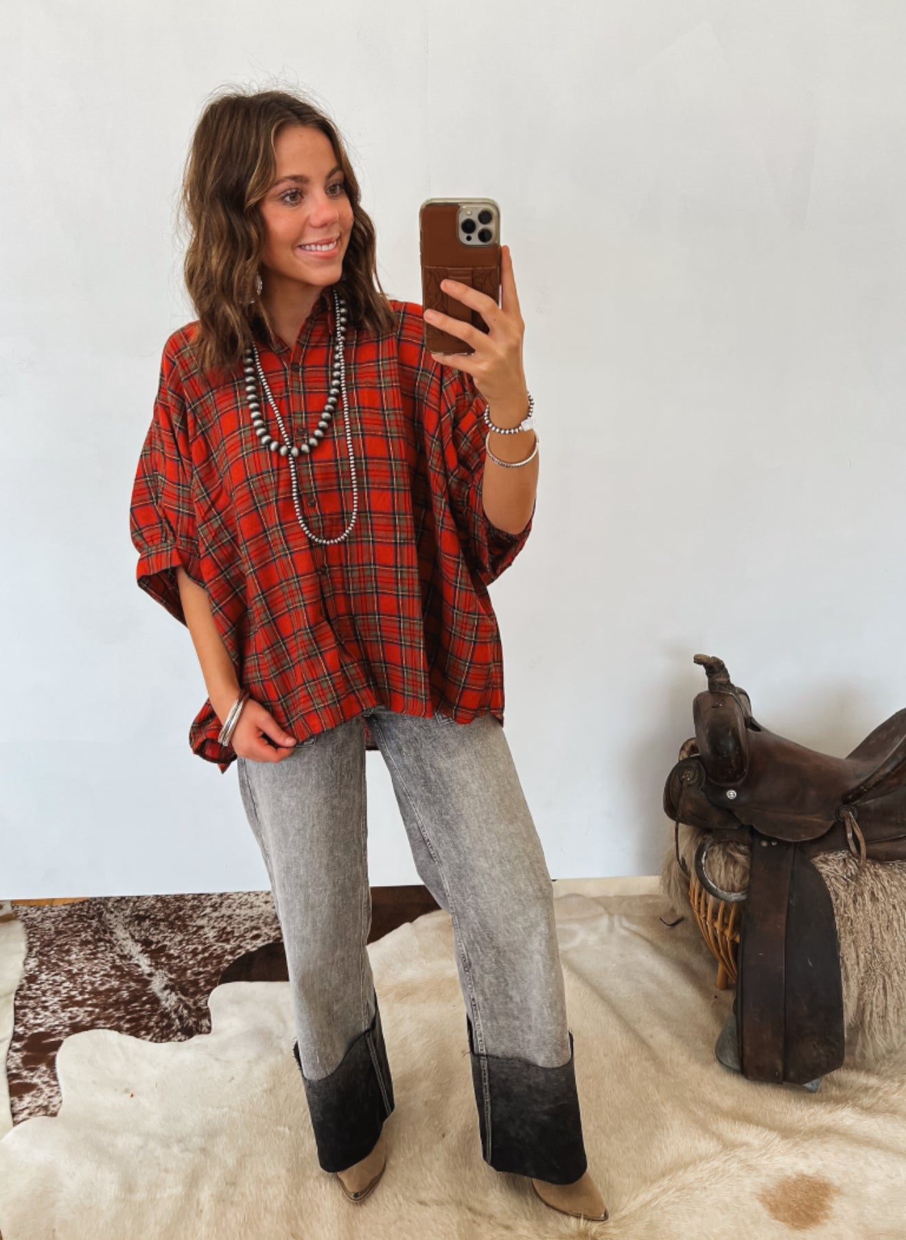 Cozy, festive, and perfectly oversized — the Howdy Holidays Plaid Oversized Top brings all the cheerful Christmas charm with that effortless western twist. Designed with a relaxed, drapey fit, this top features a classic red plaid pattern that feels instantly nostalgic, while the button-front and soft collar keep it timeless and easy to style. Lightweight and ultra-comfortable, it’s the holiday shirt you’ll reach for all season long.