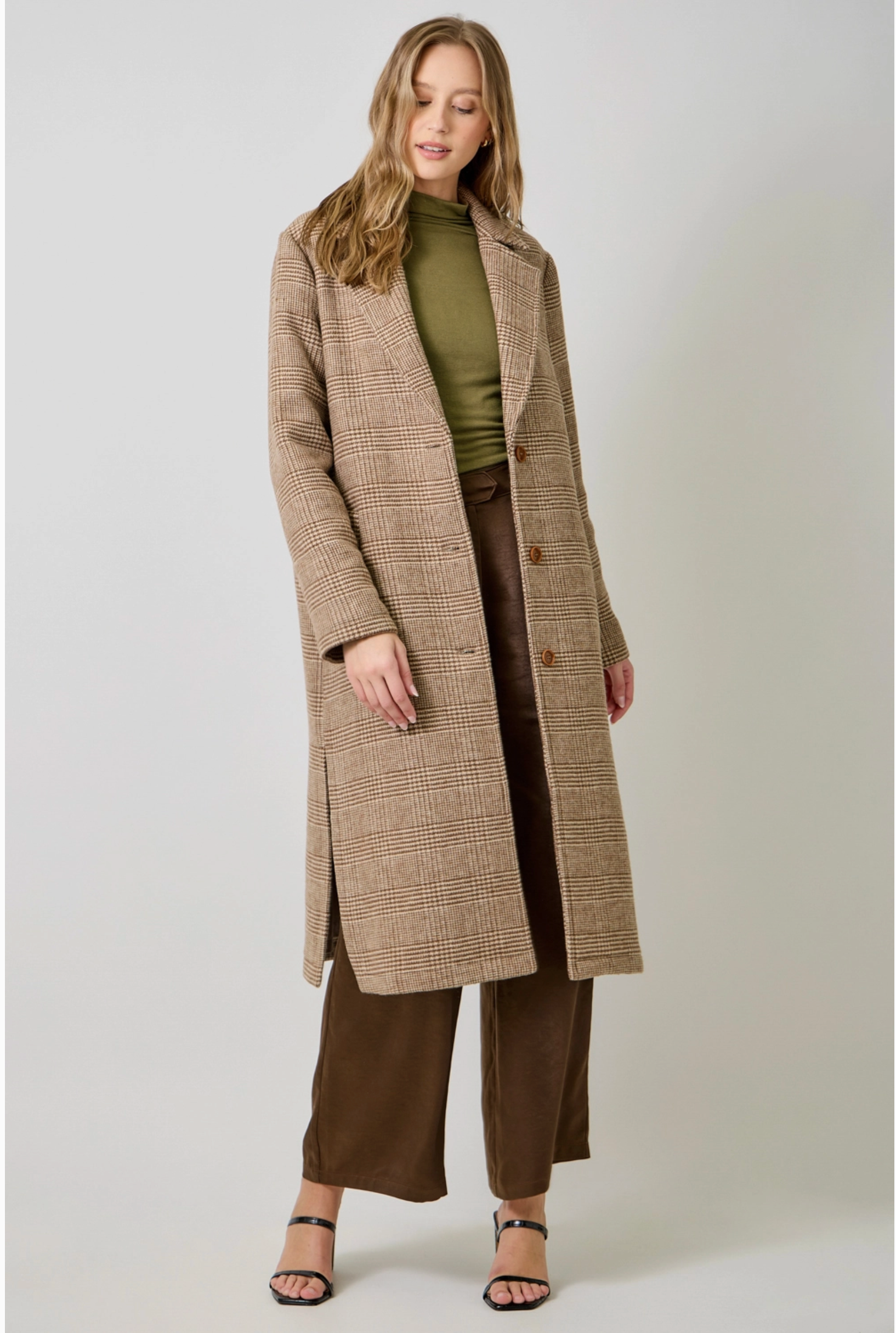 Classic, structured, and perfectly western-chic — the Houndstooth Cowgirl Plaid Jacket Coat brings timeless tailoring to everyday cool-weather style. Designed in a traditional houndstooth plaid, this long-line coat features a clean button-down front, functional side pockets, and side slits for movement and ease. The midi length adds elegance while keeping you warm, making this a throw-on-and-go essential for winter ranch days and holiday outings alike.