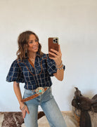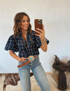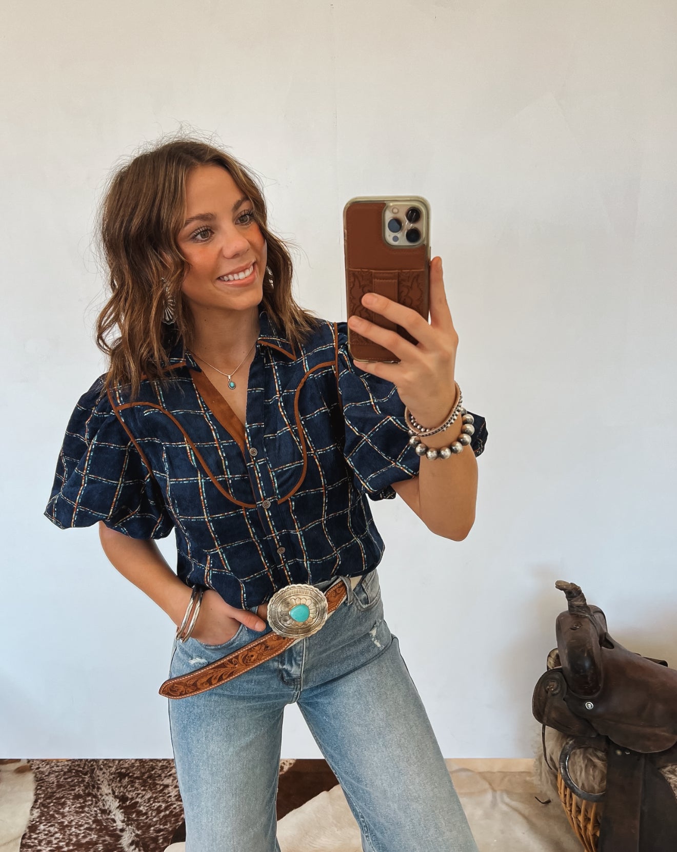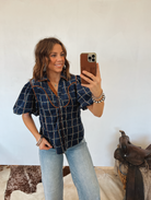 Classic Western charm meets feminine flair in the Plaid Puff Sleeve Blouse. Designed with a rich navy plaid pattern and standout puff sleeves, this top brings a bold yet polished look perfect for dressing up your everyday denim.