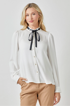 Timeless, feminine, and effortlessly polished — the Ruffle and Ribbon Blouse is the perfect blend of classic charm and modern elegance. Featuring a soft ruffled neckline trimmed with contrast ribbon, this blouse is made to stand out whether you're styling it for work, dinner, or a dressy daytime look.
