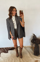 Sophisticated with a western edge — the Smoky Mountain Open Sleeve Plaid Blazer brings classic tailoring together with a bold, modern twist. Designed with an open-sleeve silhouette that flows like a cape, this blazer moves with you while still offering the structure of traditional plaid suiting. The neutral charcoal pattern makes it endlessly versatile — timeless, polished, and subtly cowgirl-cool.