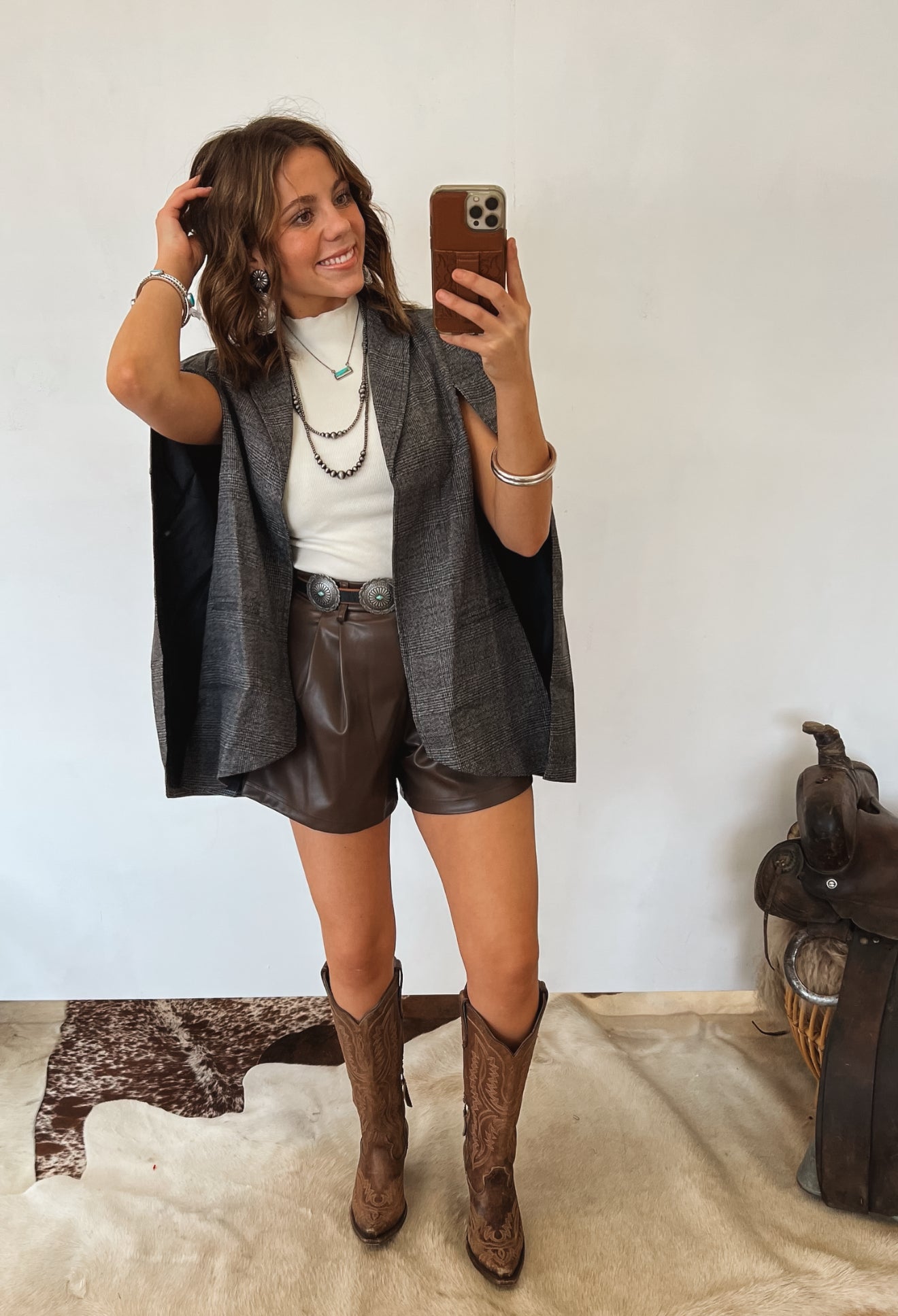 Pair with leather shorts and tall boots for a bold western-city blend, or layer over a simple mock neck and denim for a sharp everyday statement. Add turquoise accents for the perfect finishing touch.