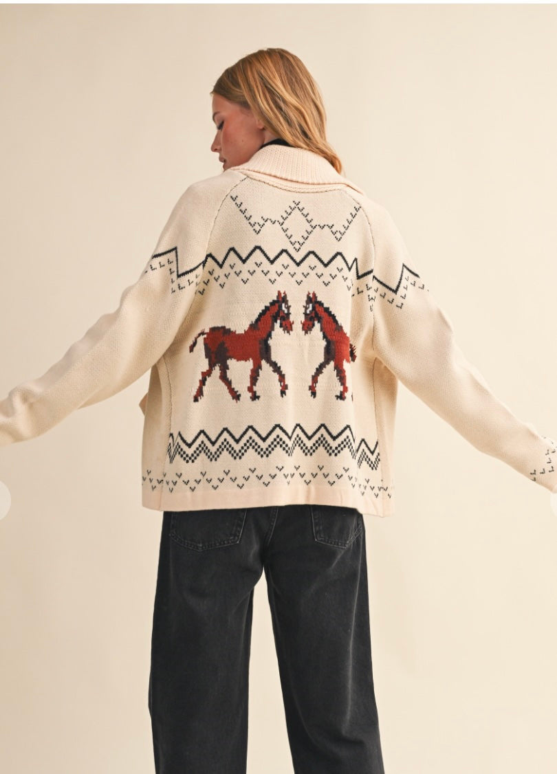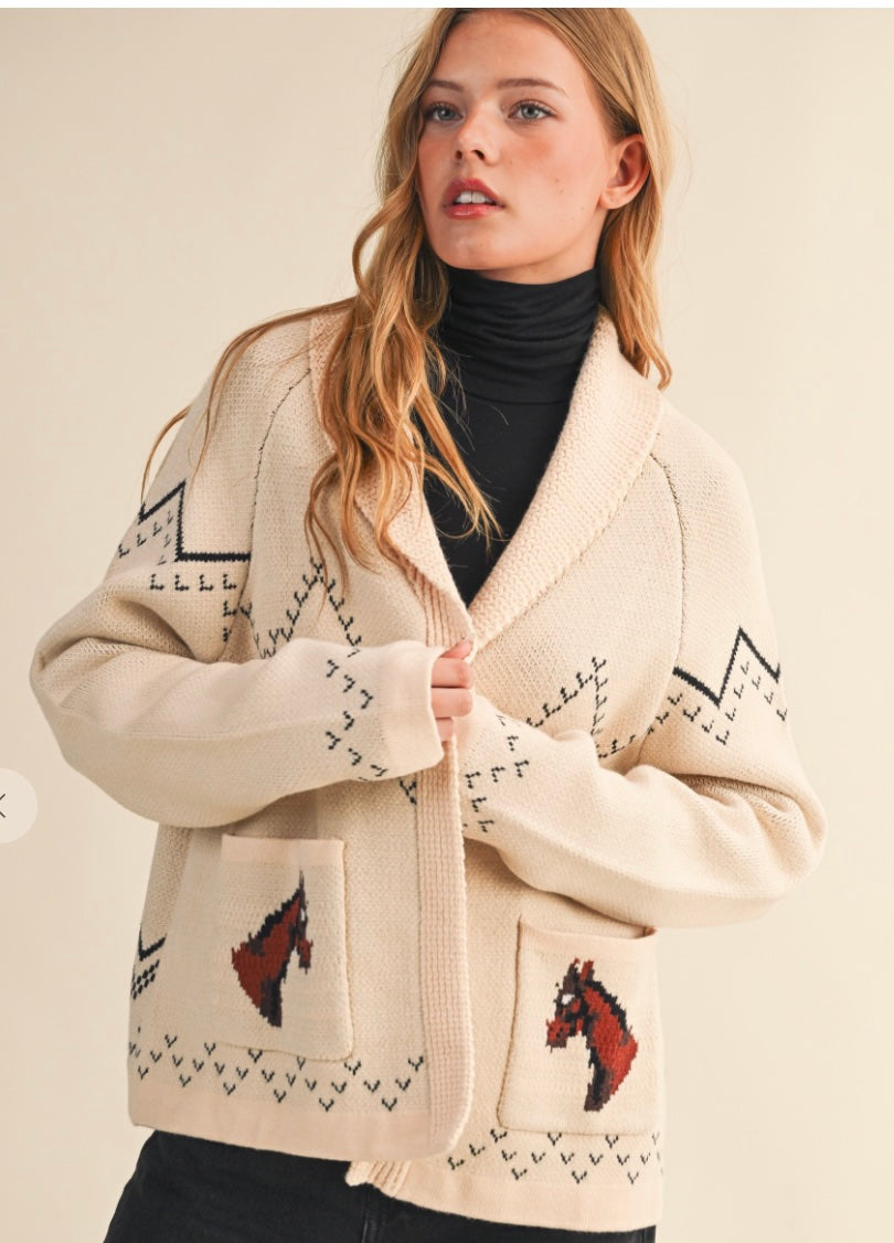 Cozy, western-inspired, and effortlessly elevated — this knit cardigan brings a timeless ranch-ready charm to any wardrobe. Designed with a soft, relaxed fit, it features a warm shawl collar, open-front silhouette, and raglan-seam long sleeves for easy layering. Front patch pockets are accented with a subtle horse motif, while a larger matching horse graphic on the back adds that signature statement detail shoppers love.