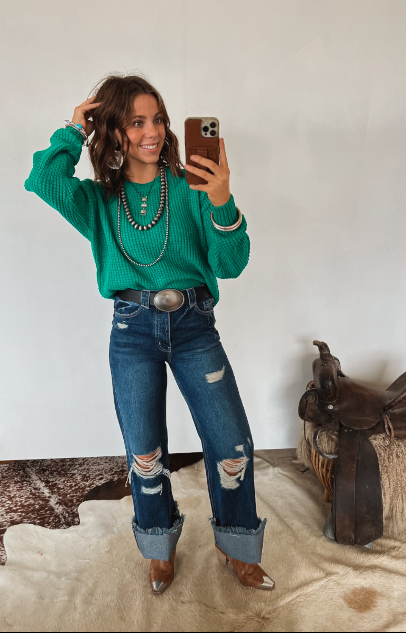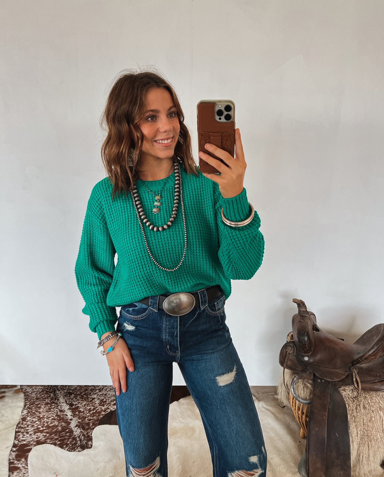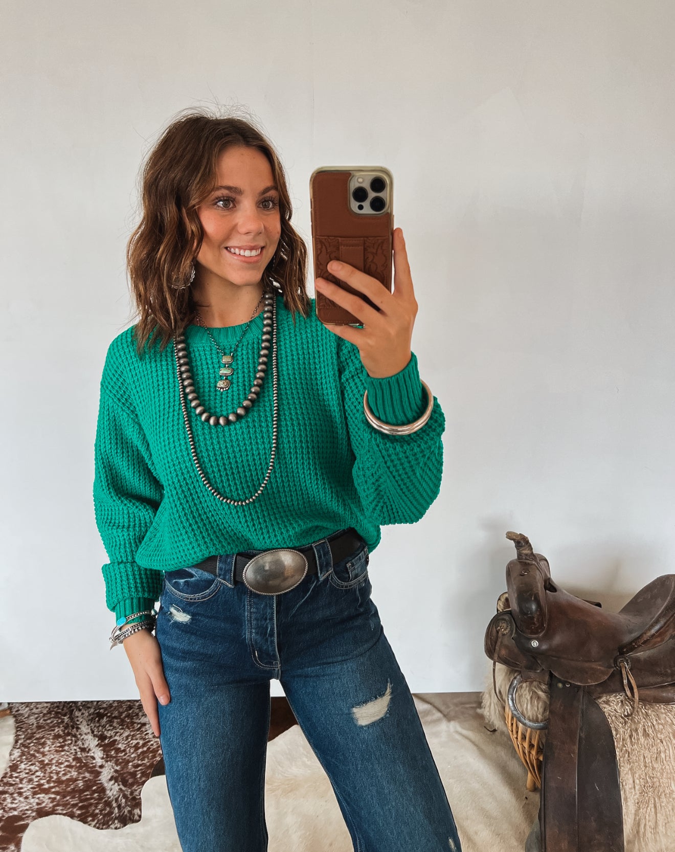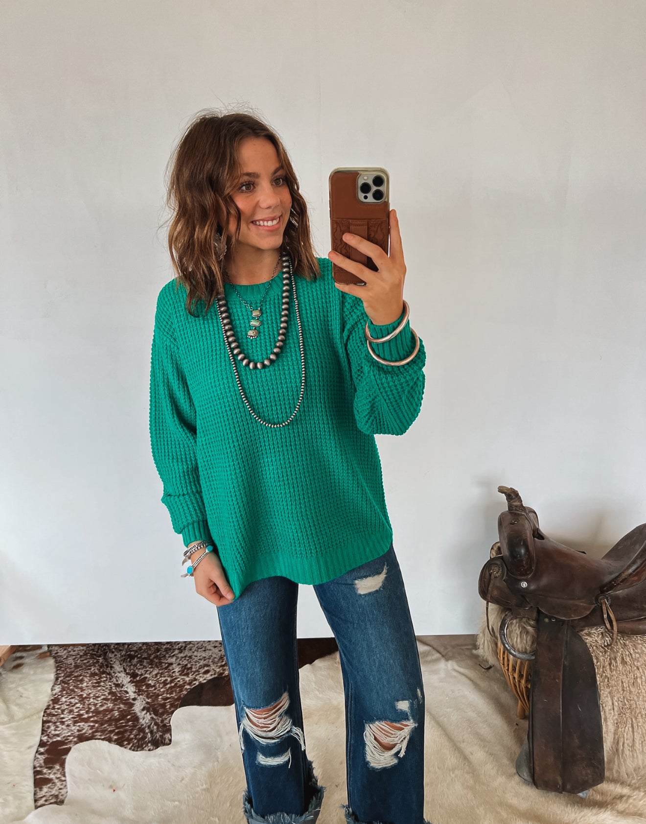 Made with a waffle knit texture, this sweater is perfect for staying warm and stylish.