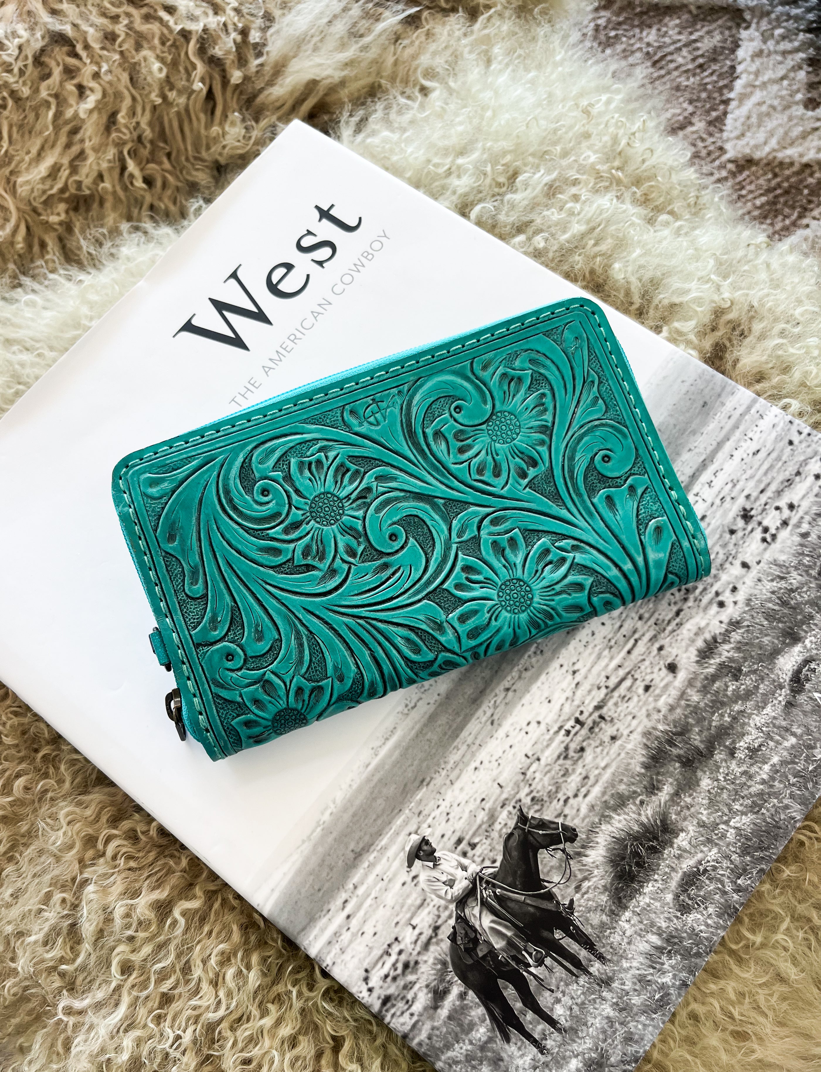 Classic western charm meets everyday functionality. The Turquoise Tooled Leather Wallet is beautifully crafted from genuine leather and features intricate floral tooling that highlights the natural grain of the hide. Each piece is uniquely detailed, giving you a timeless, elegant look that only gets better with age.