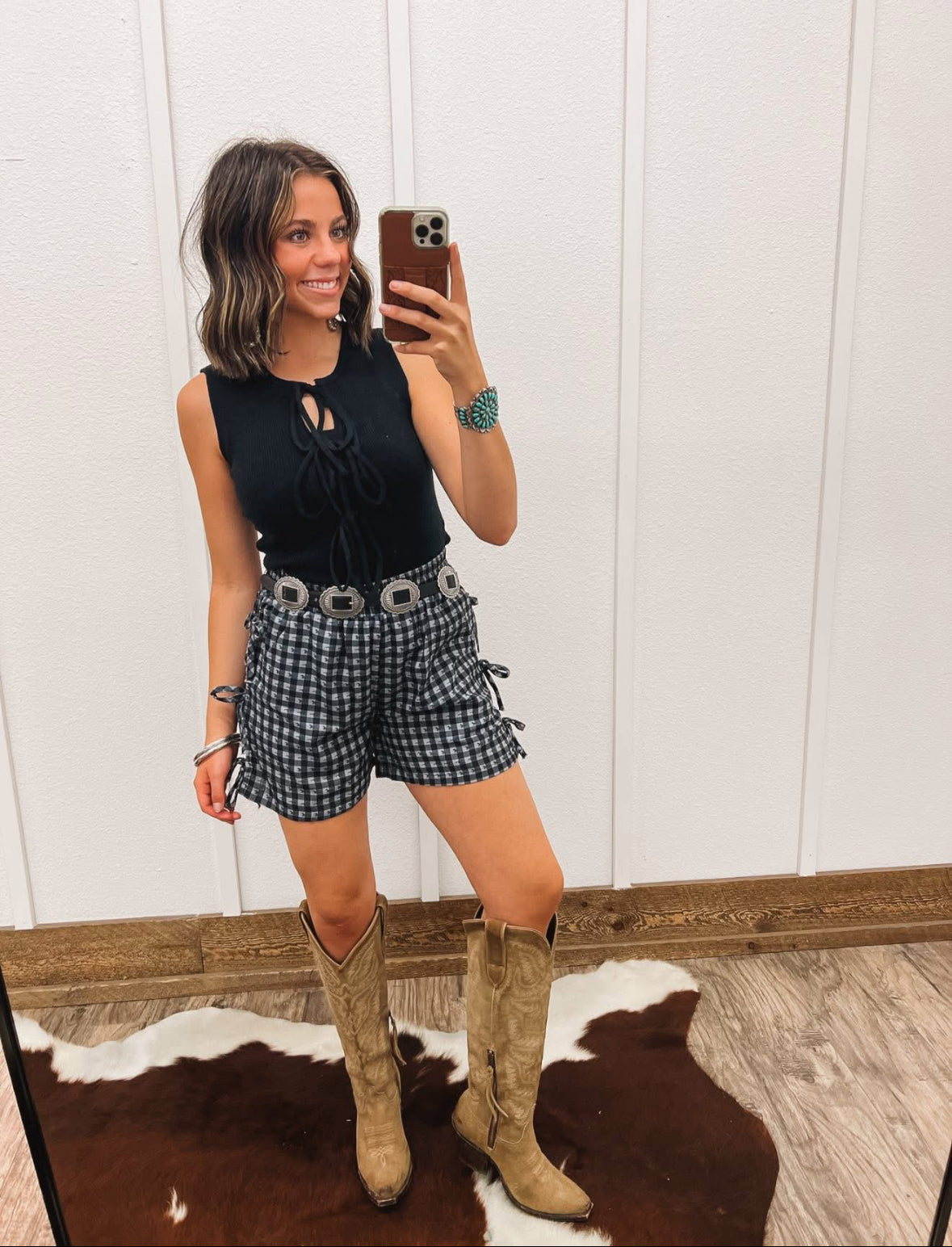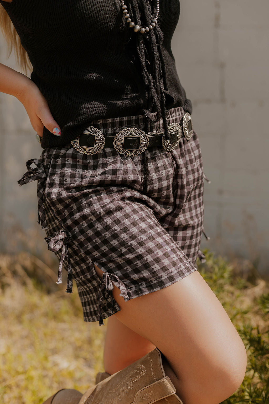 Take your summer style for a spin in the Gingham Giddy On Up Shorts—where sweet meets spunky. These mid-rise shorts feature a classic black-and-white gingham print with playful faux bow ties along the sides for a flirty western twist.