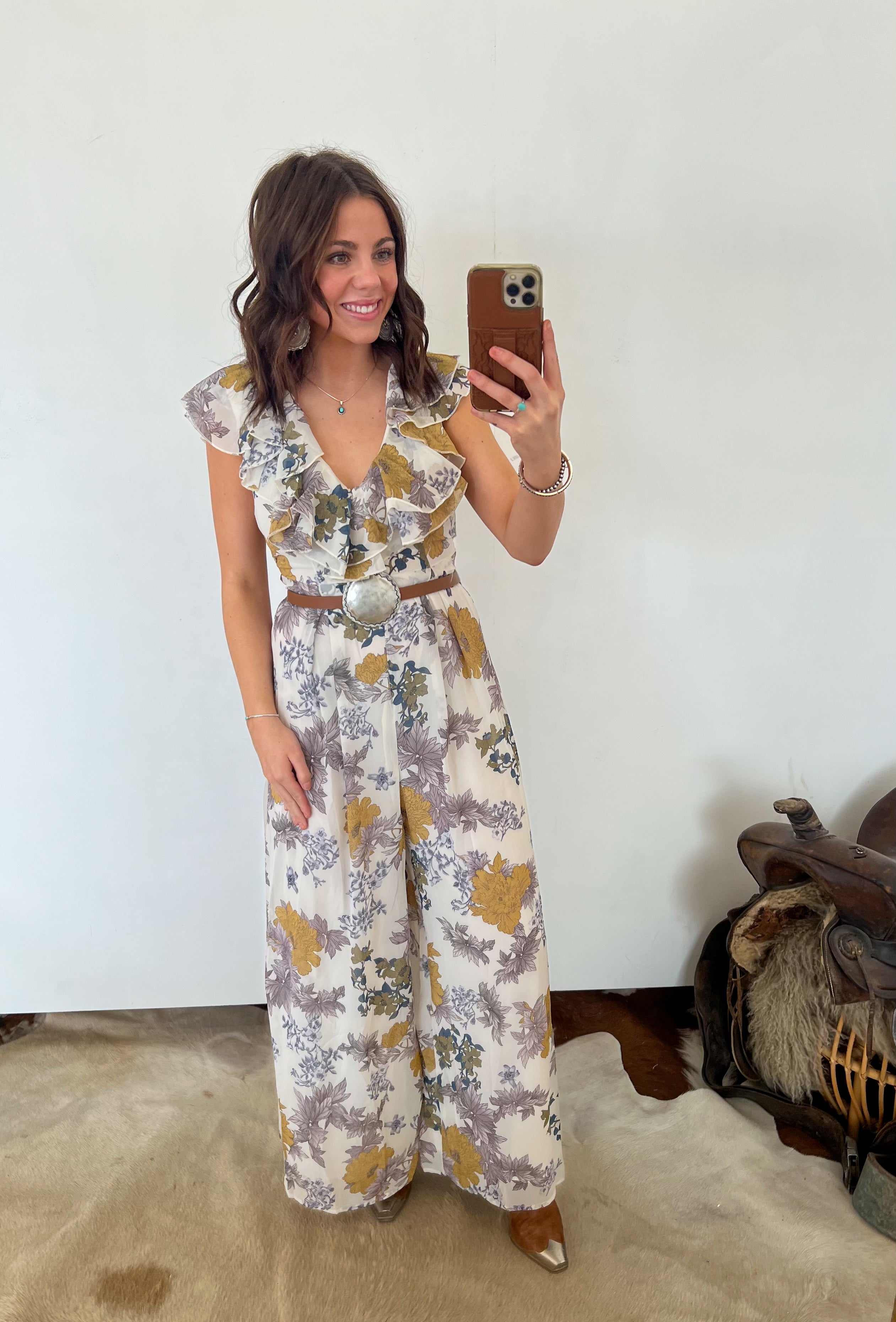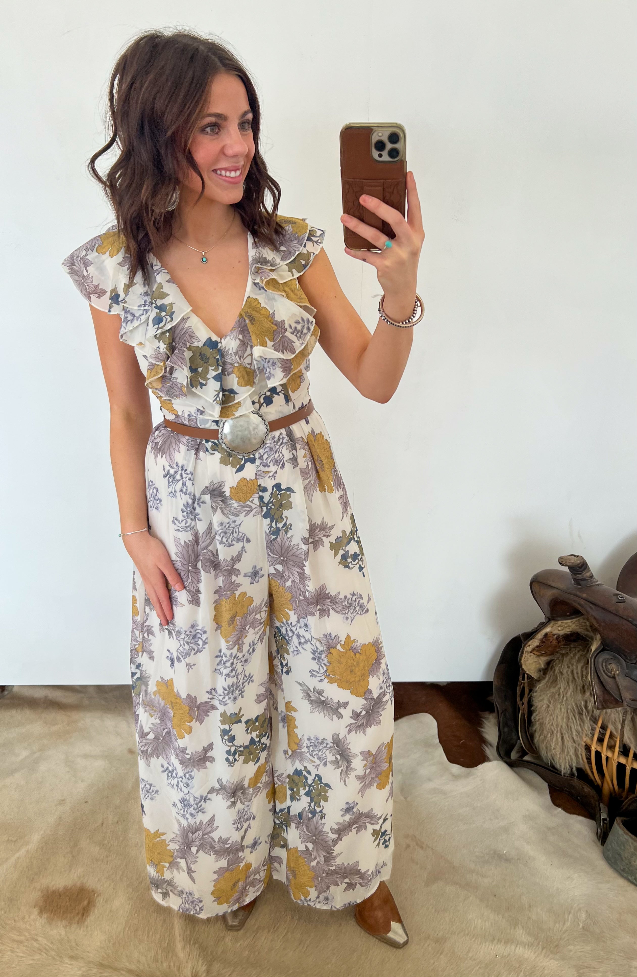 Western Waylon Ruffle Jumpsuit — a bold yet feminine statement piece designed for effortless elegance. This woven floral print jumpsuit features a cascading ruffle front that frames the neckline with soft movement and romantic detail. The sleeveless silhouette keeps it light and flattering, while the wide-leg cut creates a flowy, elongated look. Finished with a removable self-tie belt to define the waist and full lining for comfortable coverage, this jumpsuit blends western charm with modern sophistication.