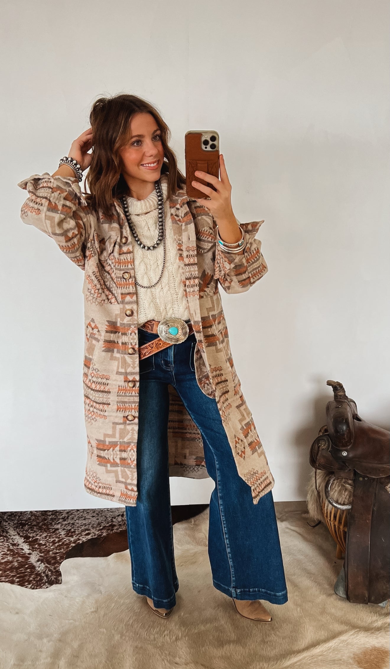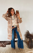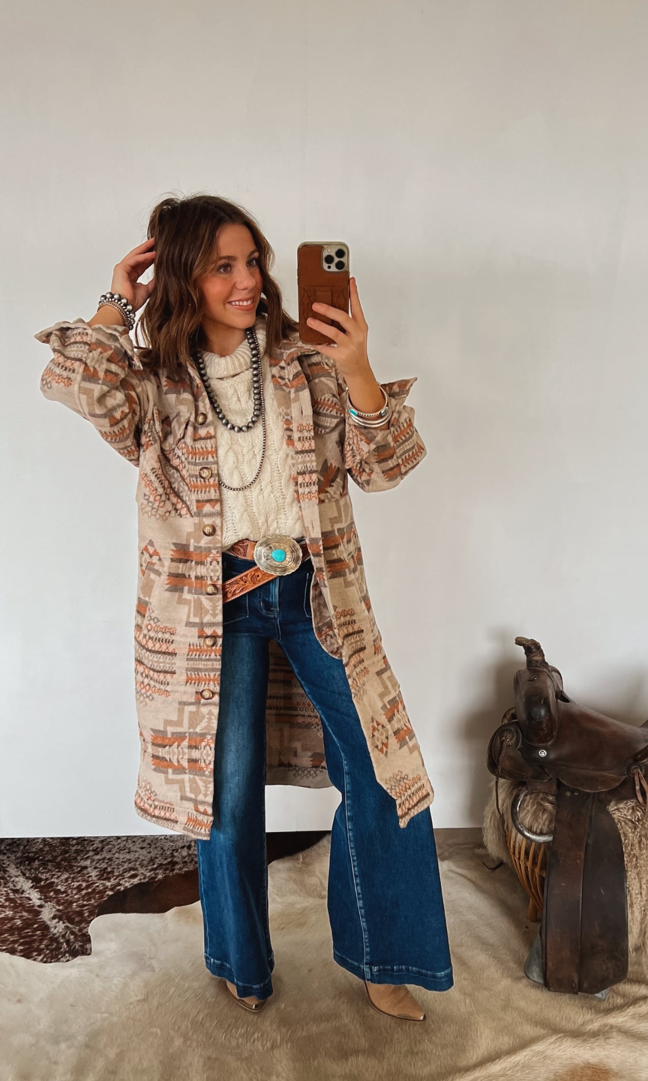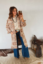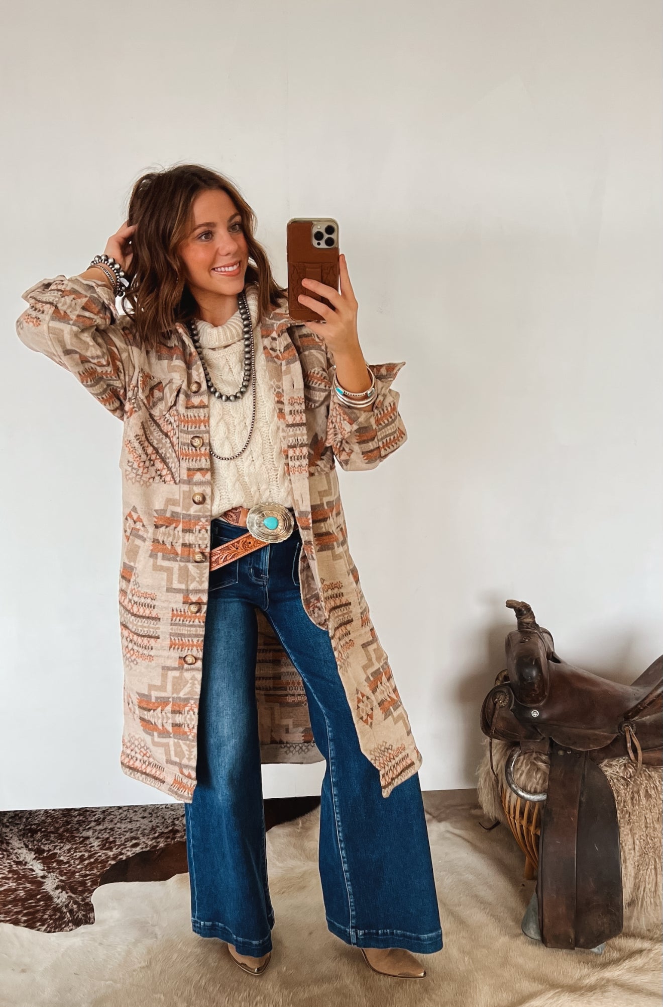 Make a bold statement with the Aztec Queen Jacket Coat, where western flair meets cozy comfort. This longline coat features a striking Aztec-inspired print in rich neutral tones, perfect for layering through the cooler seasons. Designed with a button-front closure, chest pockets, and a relaxed silhouette, it brings both warmth and effortless style to any outfit.