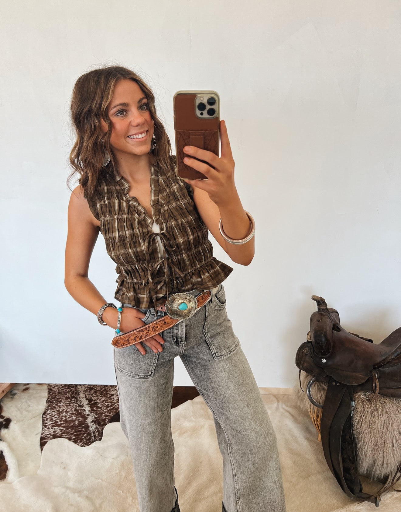 Say hello to western charm with a touch of feminine flair — the West Smocked Tank Top is made for sun-soaked days and easy styling. Crafted from 100% cotton, this sleeveless top features a ruffled neckline, smocked bodice, and a soft tie detail that gives it just the right amount of personality. Its earthy plaid tones and flattering shape make it the perfect match for high-rise denim or flowy skirts.