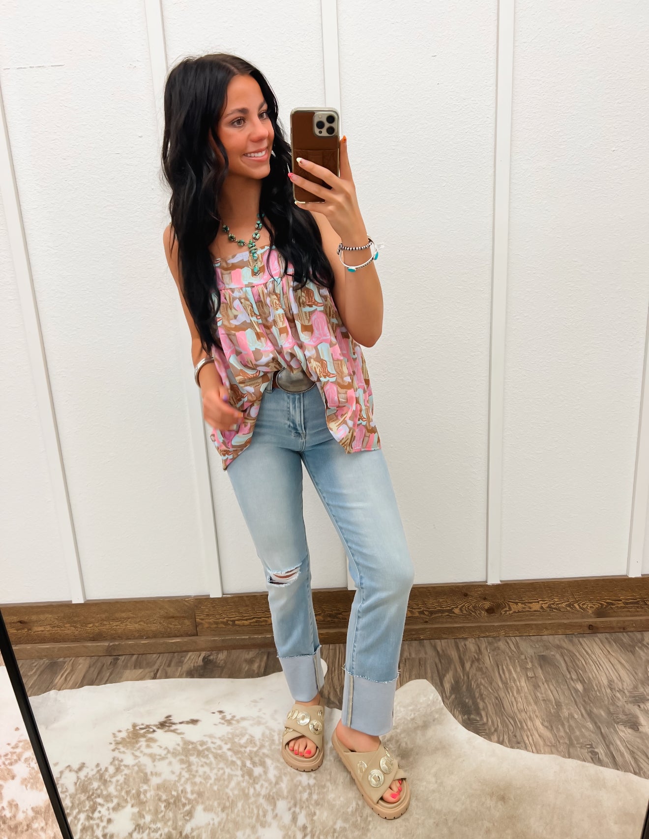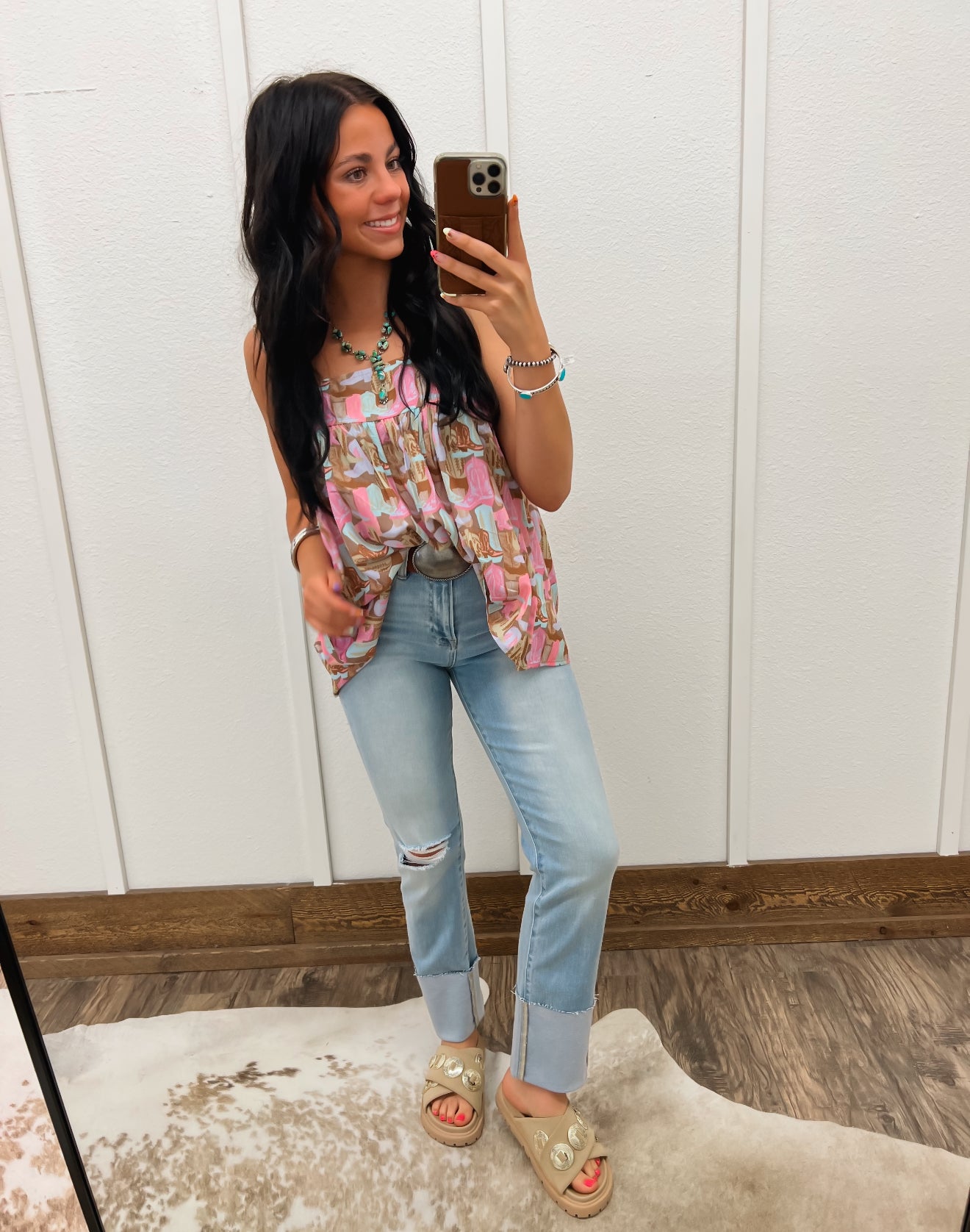 Kick up some dust and turn up the charm in the Knockin' Boots Ruffle Tank. Covered in a playful pastel boot print, this tank was made for country girls who like their outfits as bold as their attitude. With a flowy silhouette and adjustable tie-back, it’s easy, breezy, and oh-so-cowgirl cute.