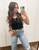 The Twisted Trail Vest in Black is perfect for your next western adventure. This vest features a secure hook and eye closure, allowing for easy wear and maximum mobility. Perfect for layering!