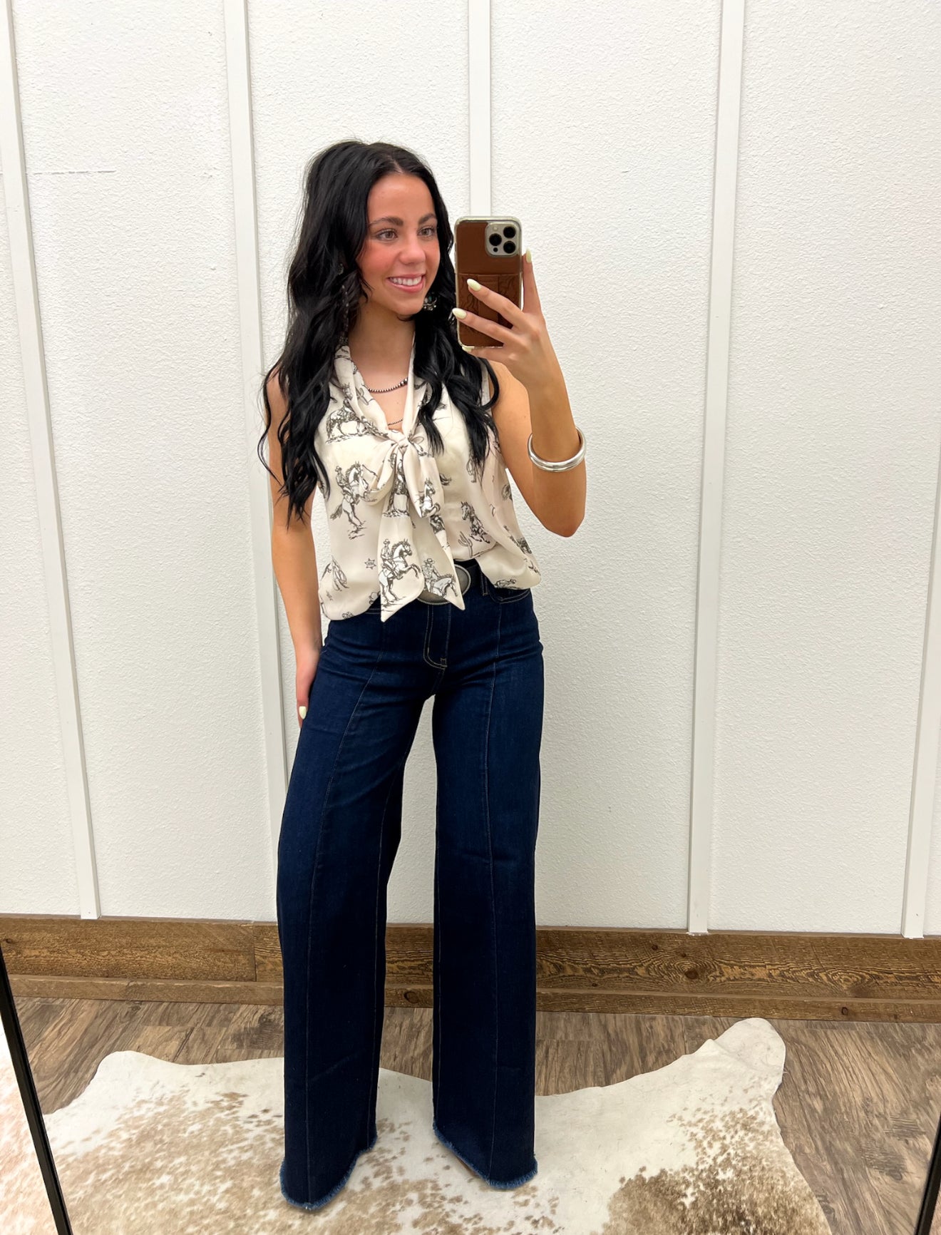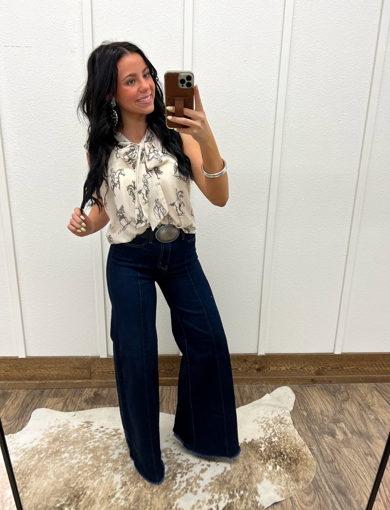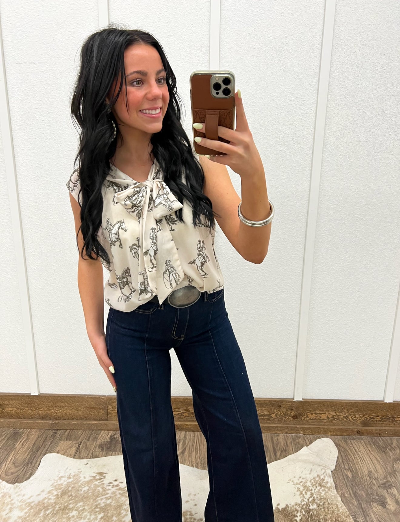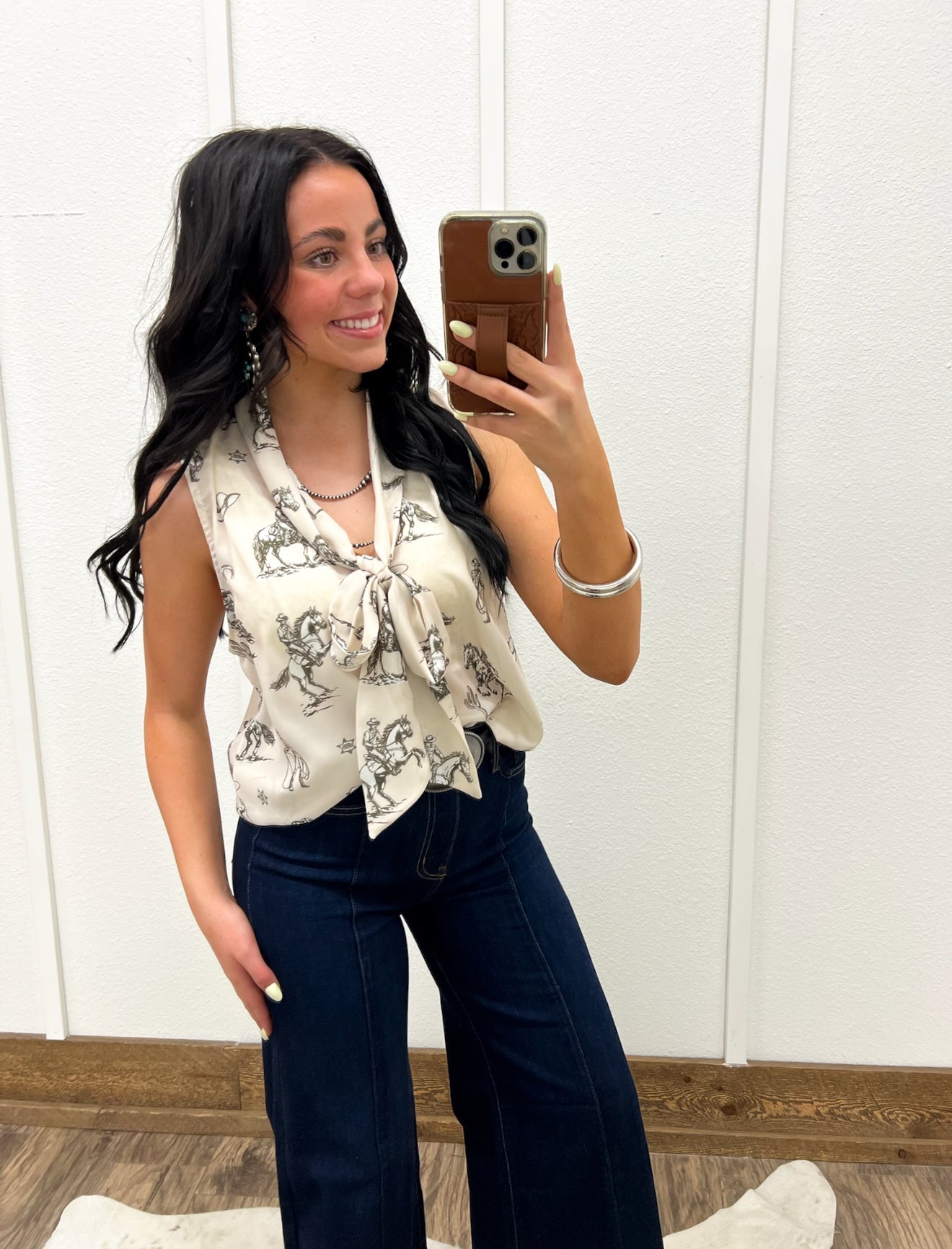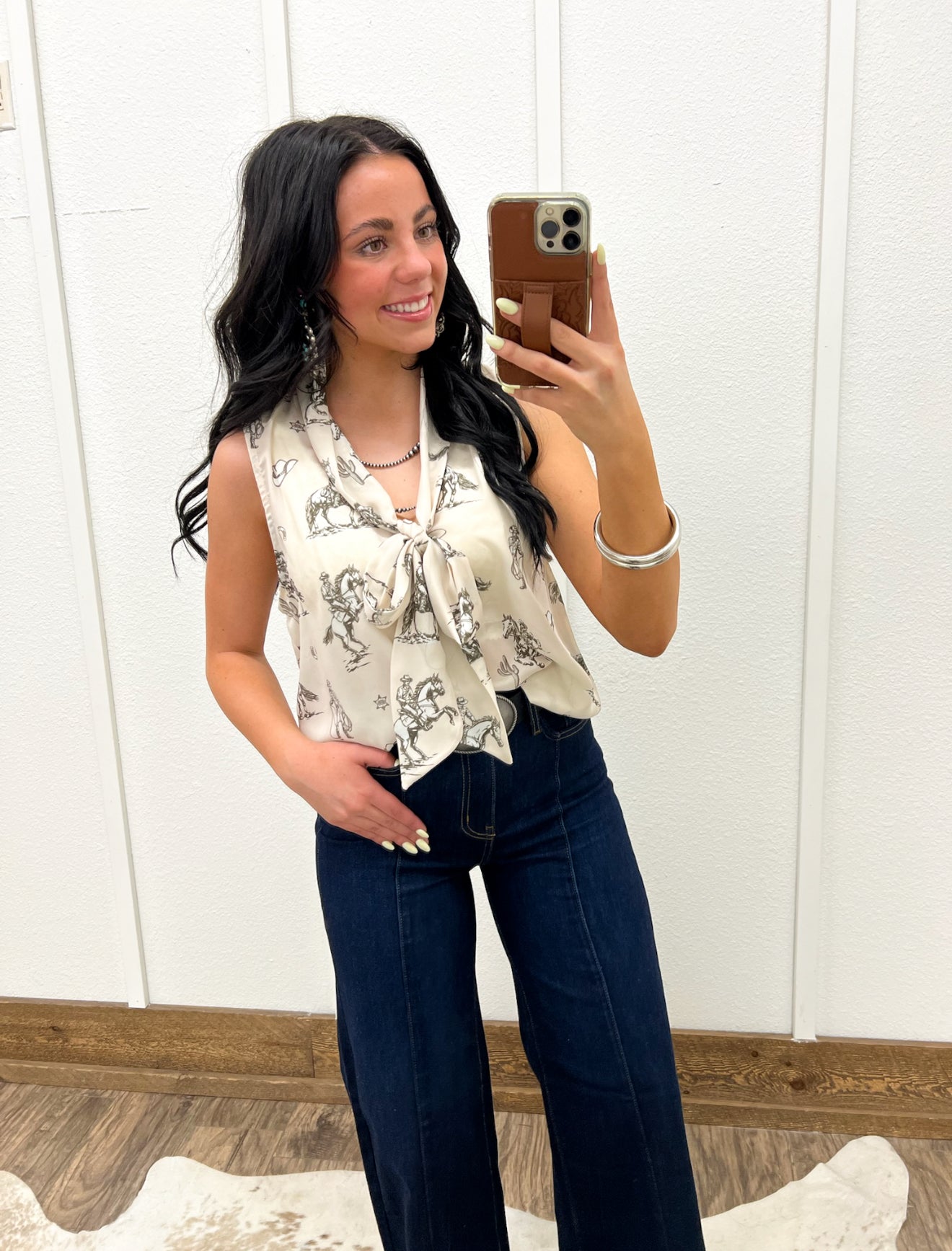 Serve up Western charm with a little attitude in this sleeveless woven top, featuring a bold sheriff-inspired lifestyle print. The tie-front detail adds a flirty twist, while the lightweight fabric keeps things cool and comfy. Perfect for rodeos, road trips, or just reppin’ that wild West spirit—this top was made for the fearless, fun-loving cowgirl.