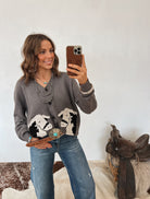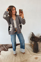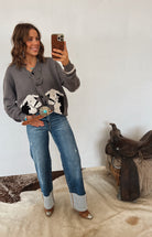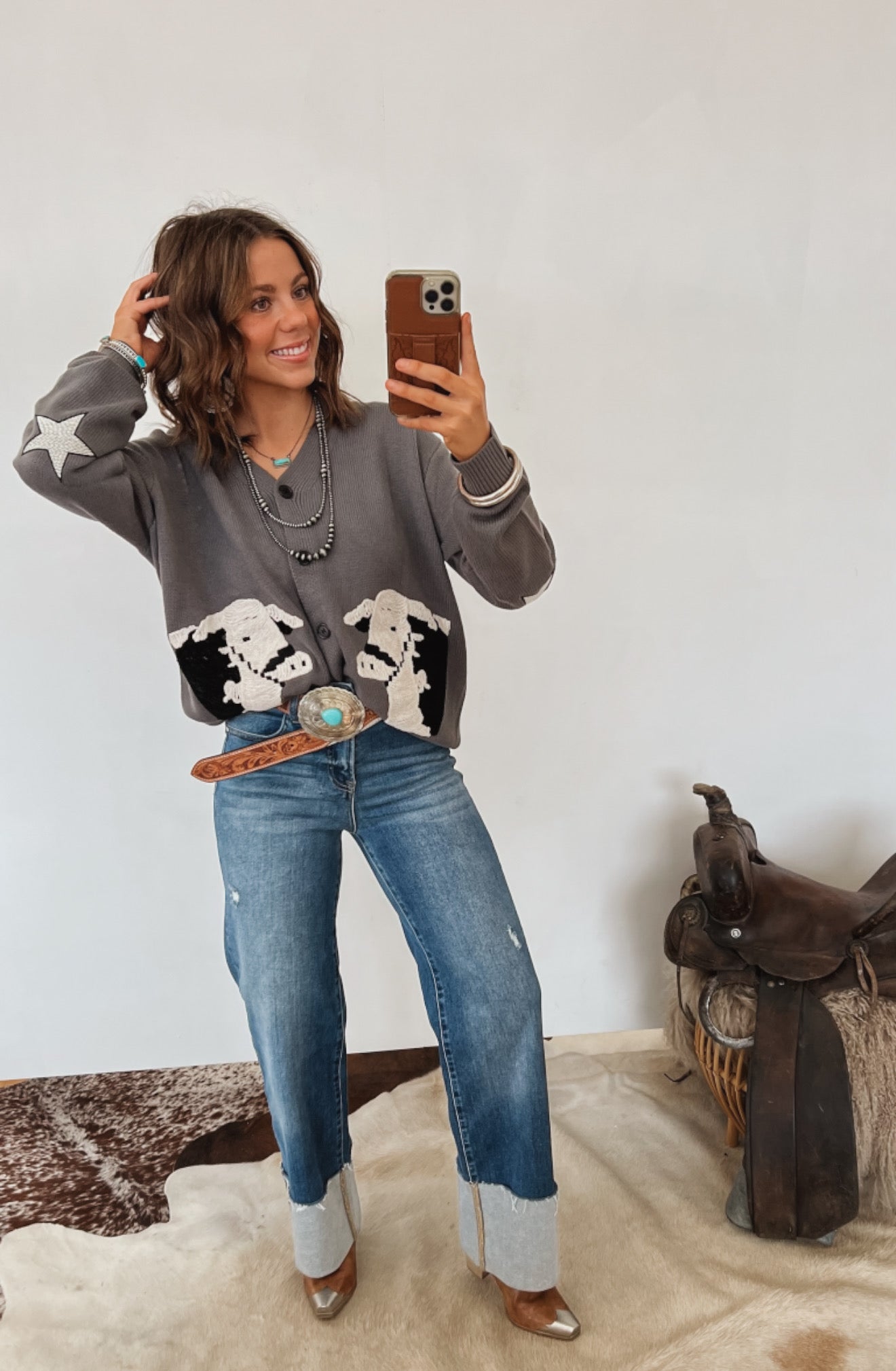 Playful, cozy, and full of western personality — the Old School Cattle Cardigan brings a fun punch of ranch-life charm to your everyday wardrobe. This soft knit cardigan features vintage-style cattle graphics stitched on each side, giving it a nostalgic, old-school western vibe that stands out without trying too hard. With its relaxed fit, classic button-front, and comfy mid-weight feel, it’s the perfect layer for cool days, evenings at the barn, or adding a little yeehaw attitude to any outfit.