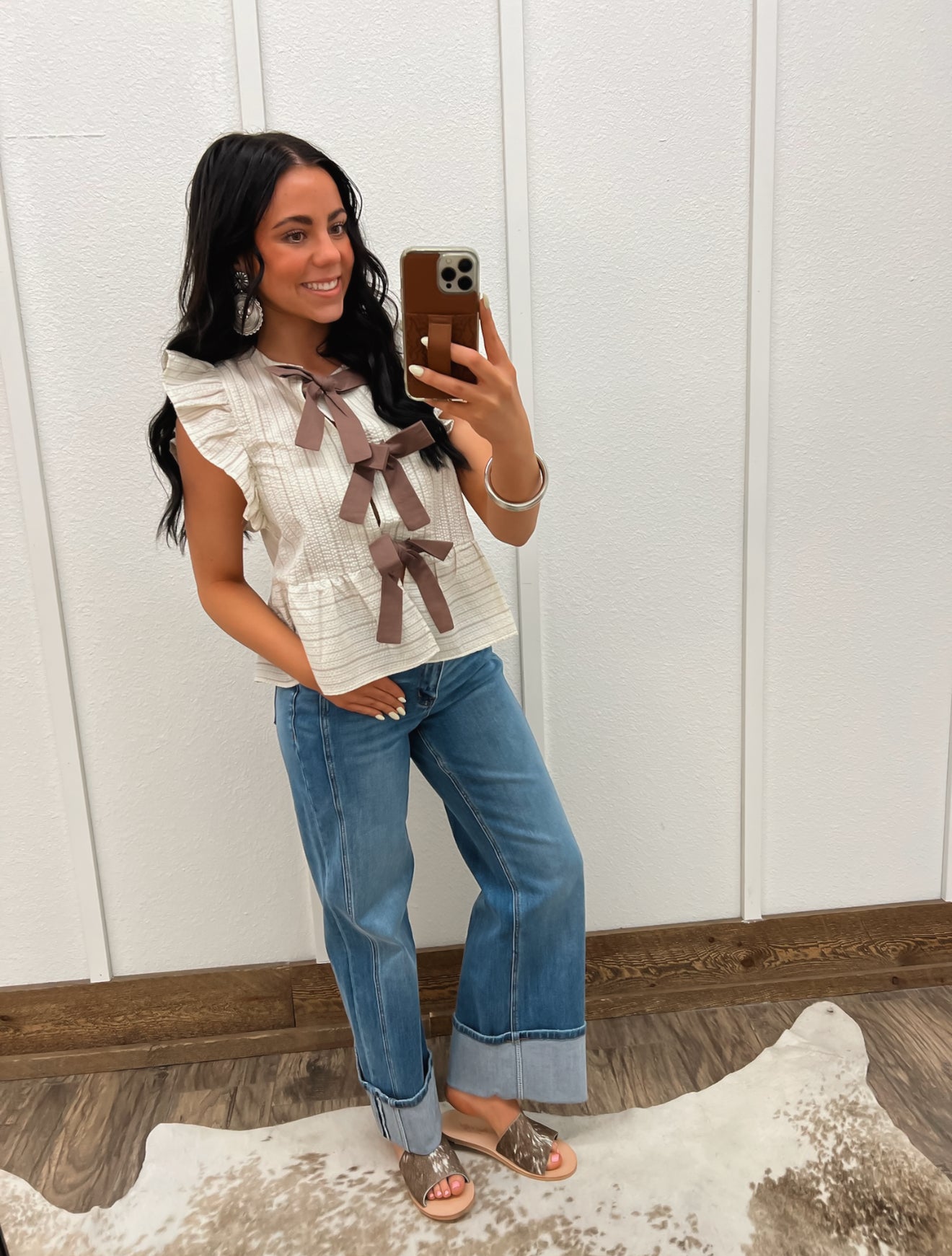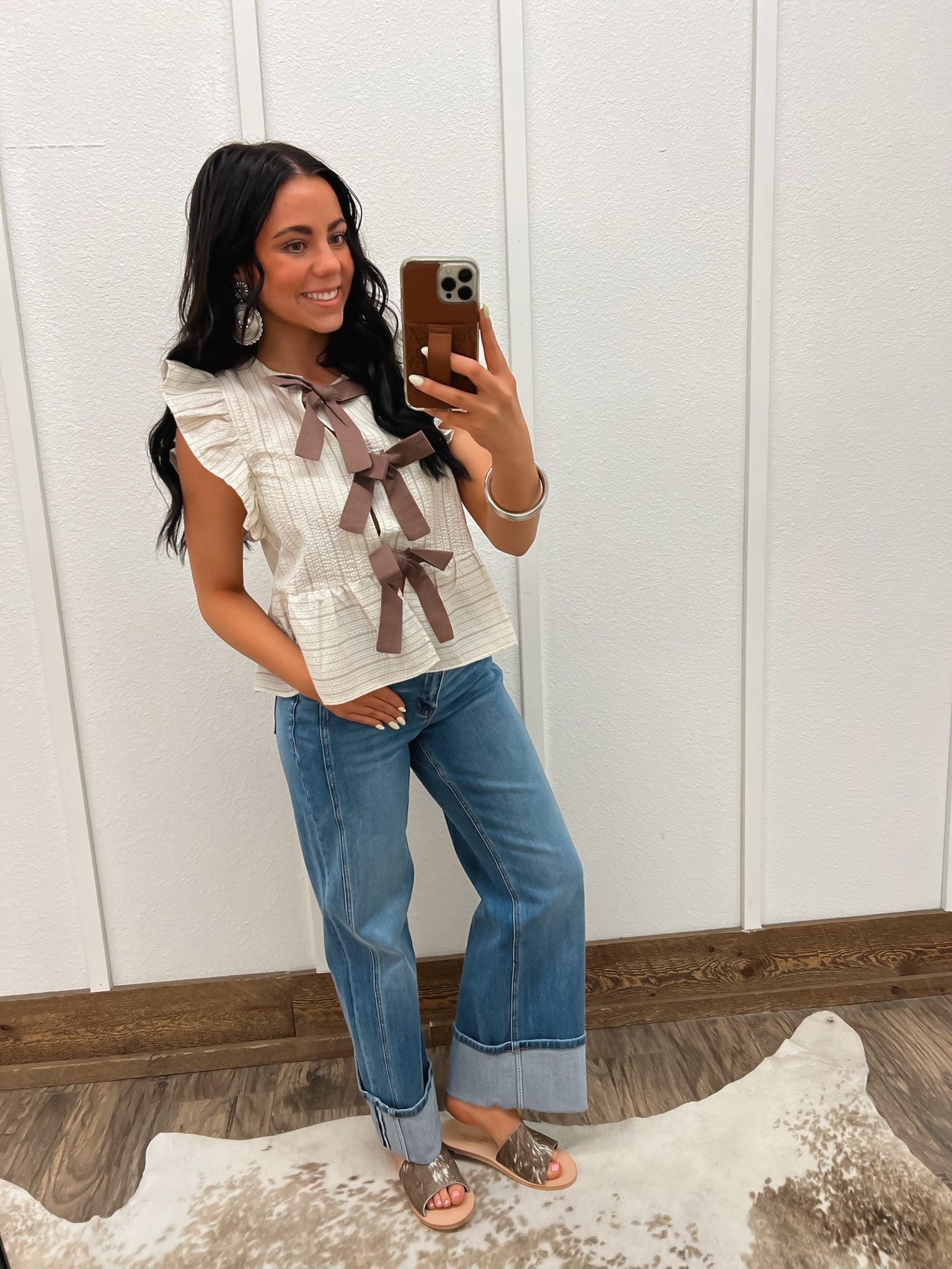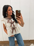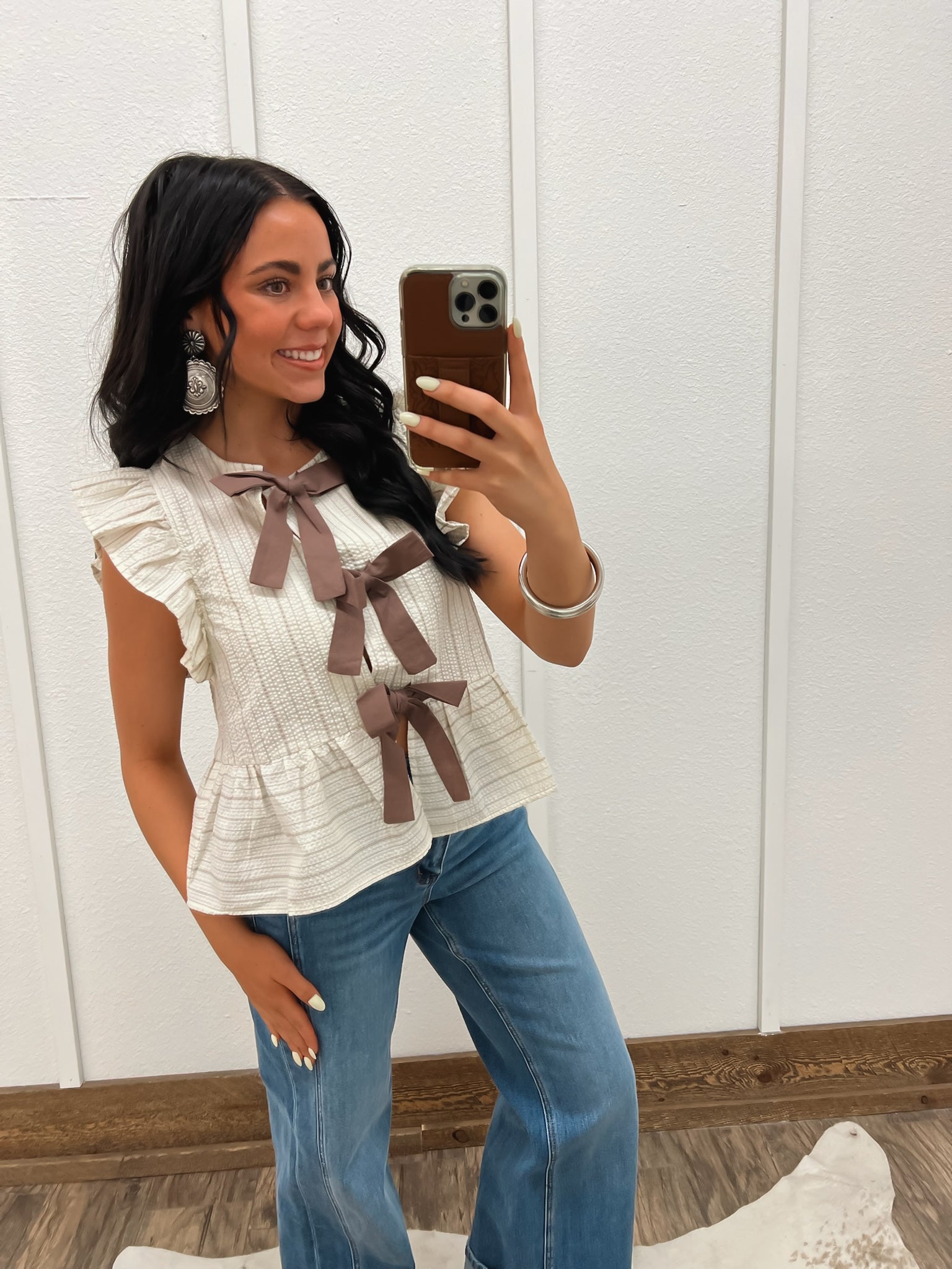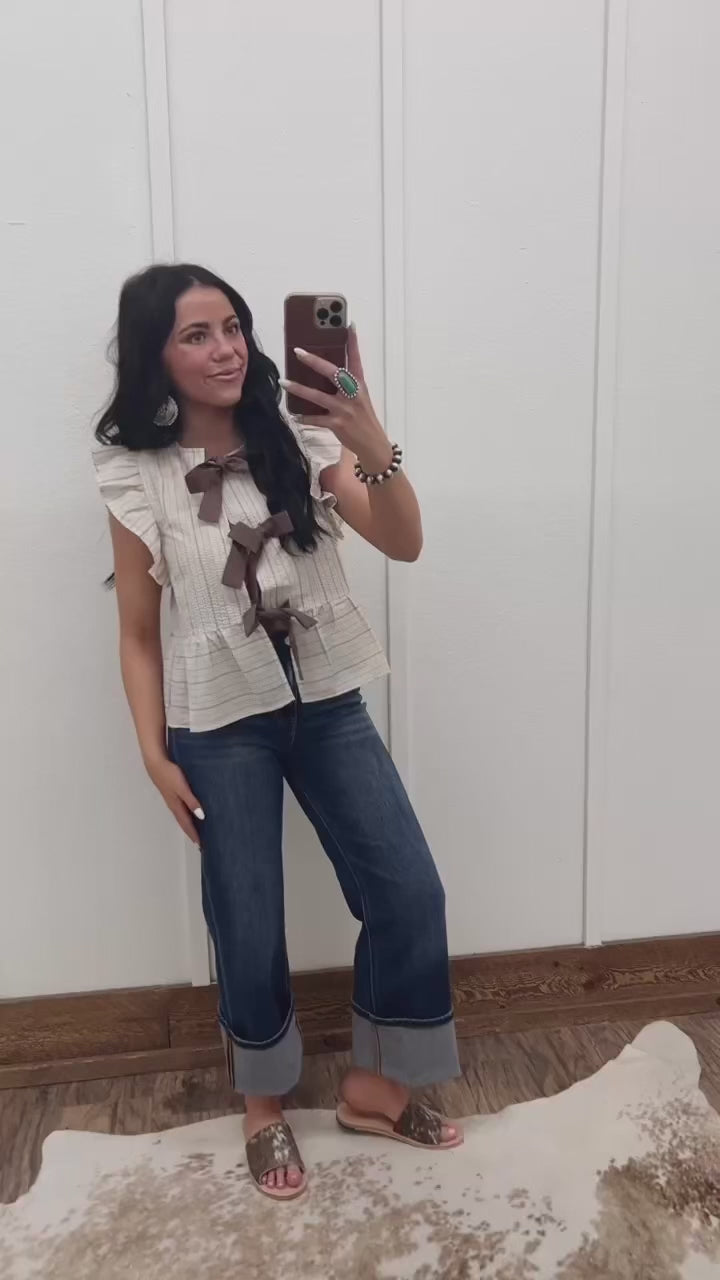 Light, breezy, and effortlessly charming—this sleeveless blouse is your new go-to for sunny days and western nights. Designed with soft vertical stripes, dainty ruffle trim, and a flirty tie-front detail, it blends feminine flair with western spirit in the best way.