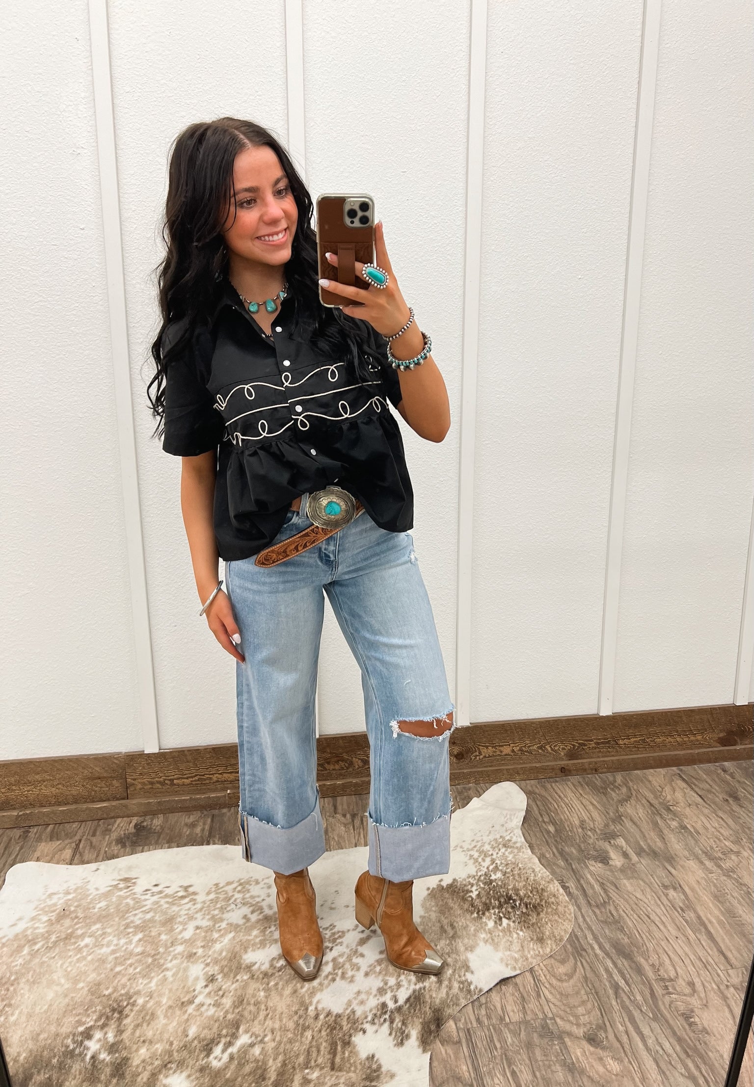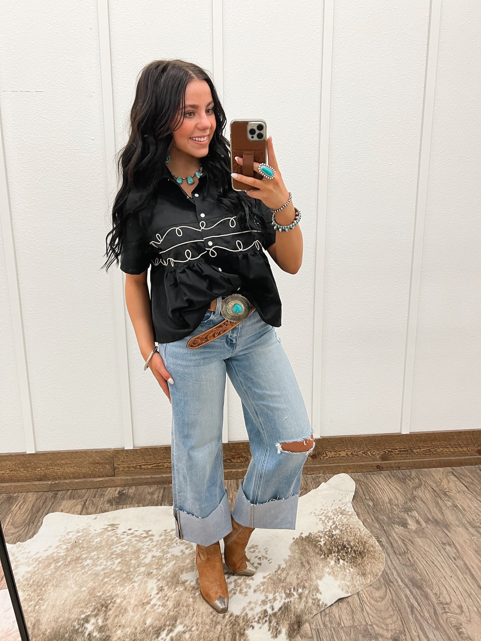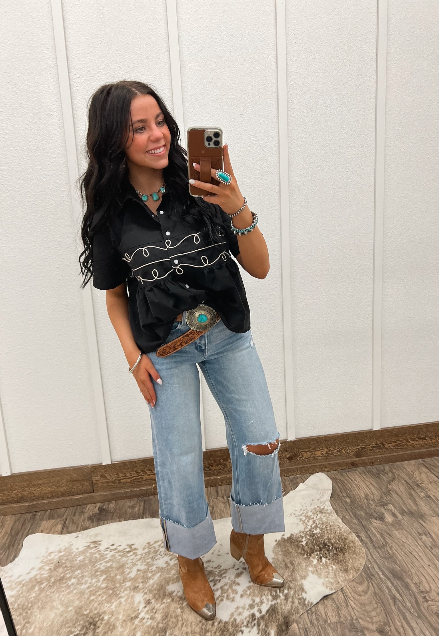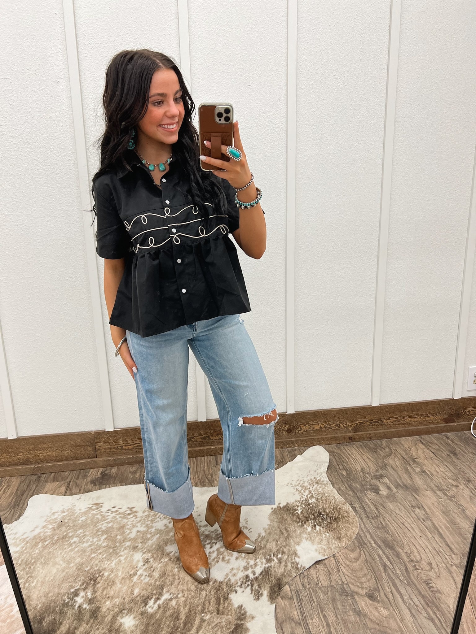 Saddle up in our Cowgirls Wanna Have Fun Top! This western-inspired top features a playful rope detail that adds a touch of fun to any outfit. Perfect for cowgirls who want to add a little extra flair to their wardrobe.