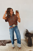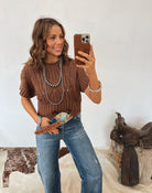 The Western Crochet Sweater Top brings that rustic, outdoorsy charm into an easy, everyday knit. Made with a soft cotton blend, this short-sleeve sweater features a beautifully textured crochet pattern that gives it a handcrafted, vintage-western feel. The ribbed hem and cuffs add structure, while the relaxed silhouette keeps it effortlessly comfortable.