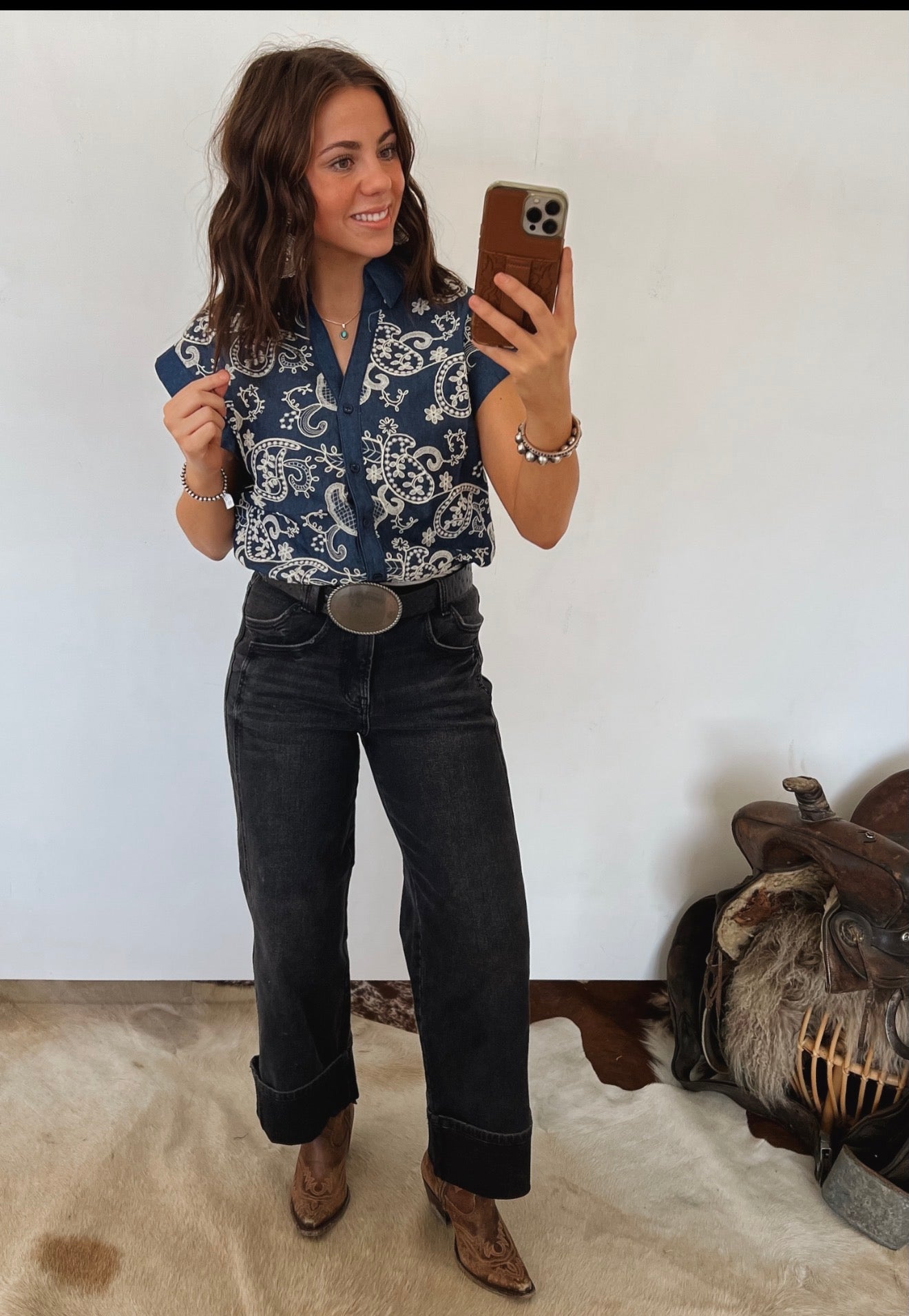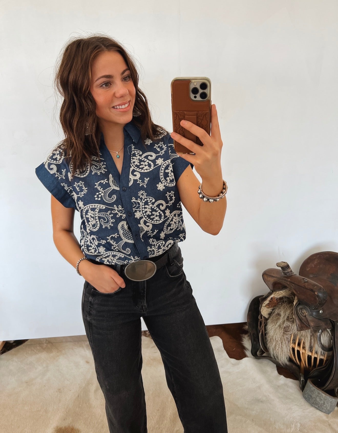 Blue Jean Baby Embroidered Top — a charming blend of classic structure and feminine detail, designed to bring effortless style to your everyday wardrobe. Crafted from 100% cotton, this embroidered blouse features a flattering elasticized waist, a soft collar with a V neckline, and intricate embroidery that adds texture and personality. The relaxed silhouette and lightweight feel make it an easy choice for warm days or layered transitional looks.