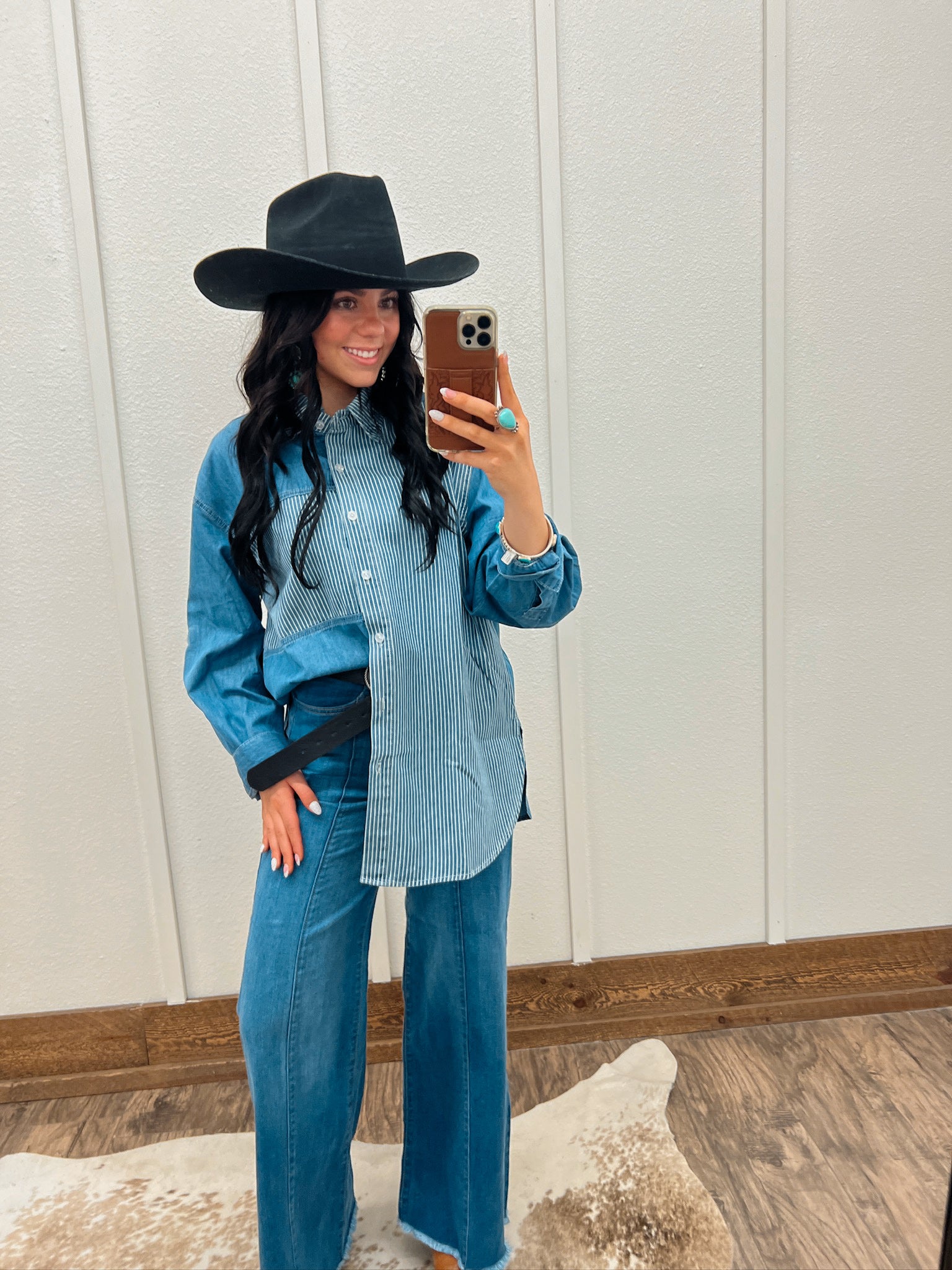 Get ready for some serious style in our Denim Lawyer Up Button Down! Made with mineral washed pinstripe color block fabric, this shirt is perfect for anyone looking to make a statement. With a western flair, this button down is sure to impress and give you the confidence to take on the day.