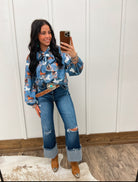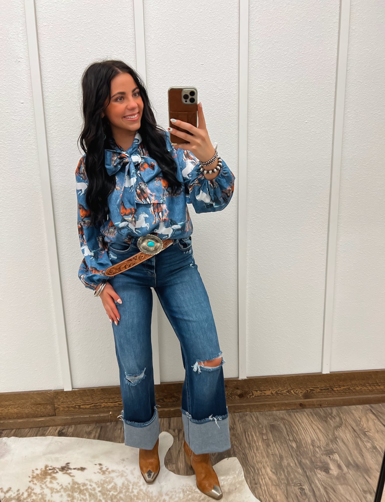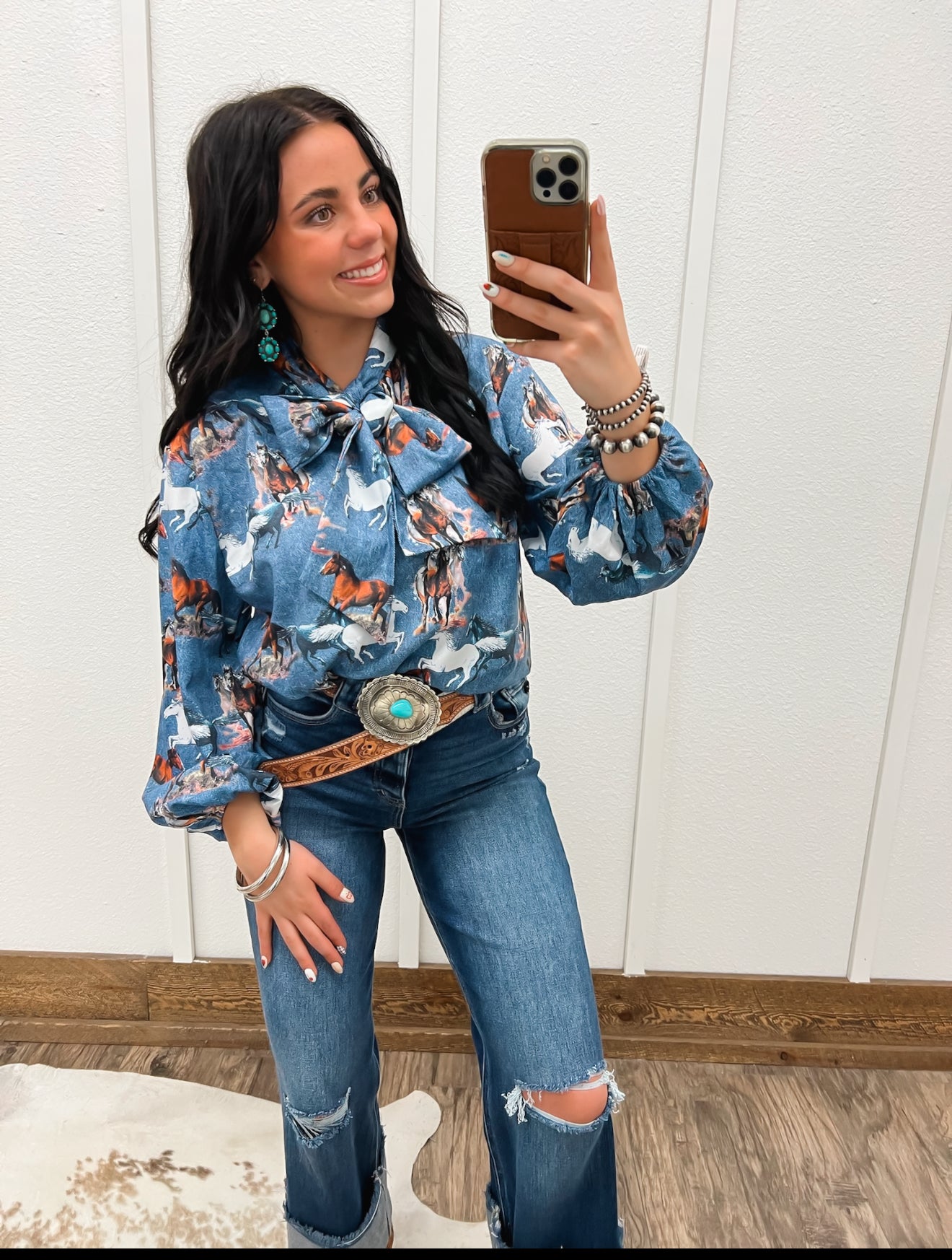 Saddle up in style with this eye-catching Denim Roaming Horses Front Tie Blouse—a bold blend of rustic charm and chic sophistication. Designed for the modern cowgirl at heart, this top features a lively all-over print of galloping horses set against a denim-inspired background. Made with lightweight, silky fabric that drapes like a dream, it’s perfect for rodeo weekends, western-themed events, or dressing up your denim days with cowgirl flair.