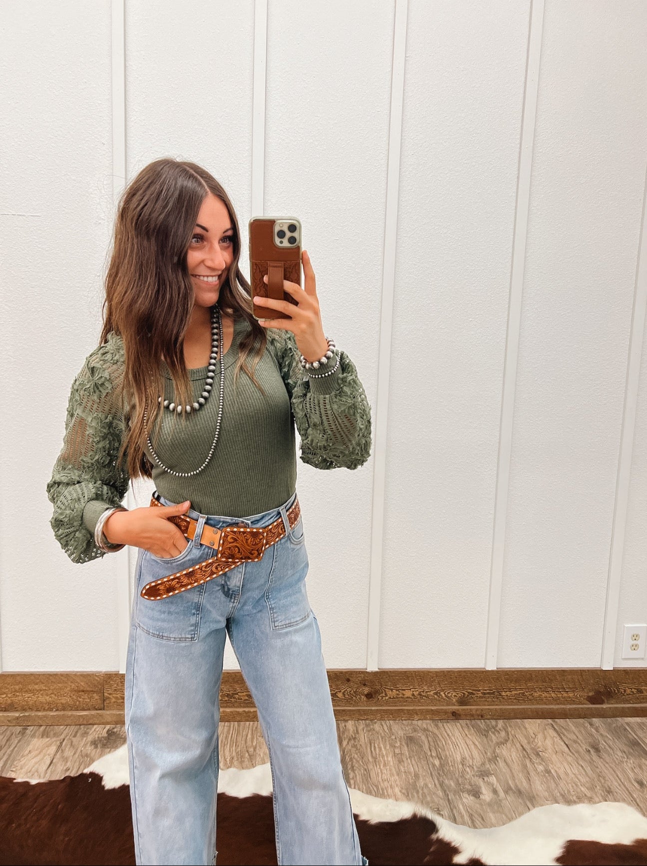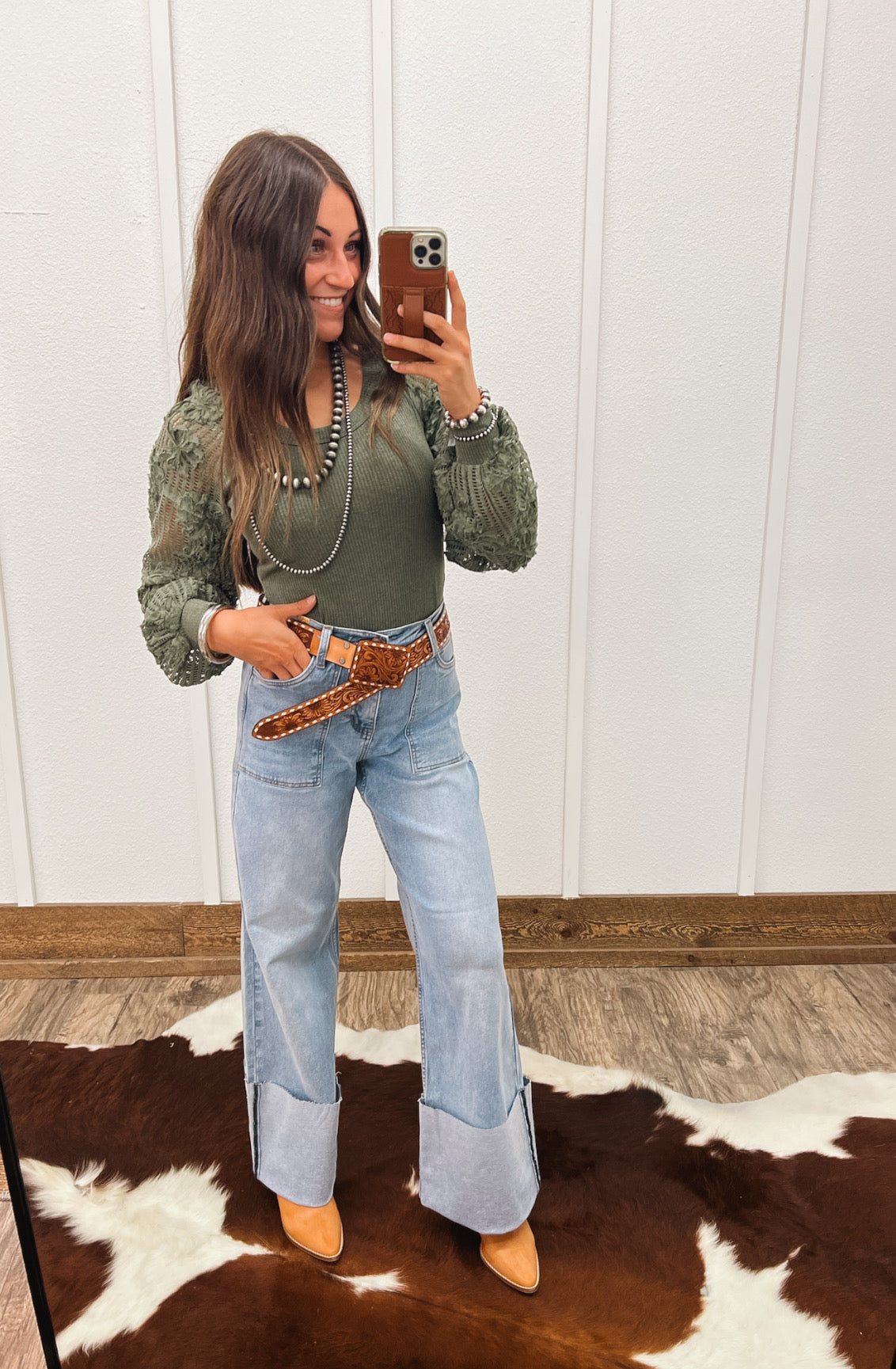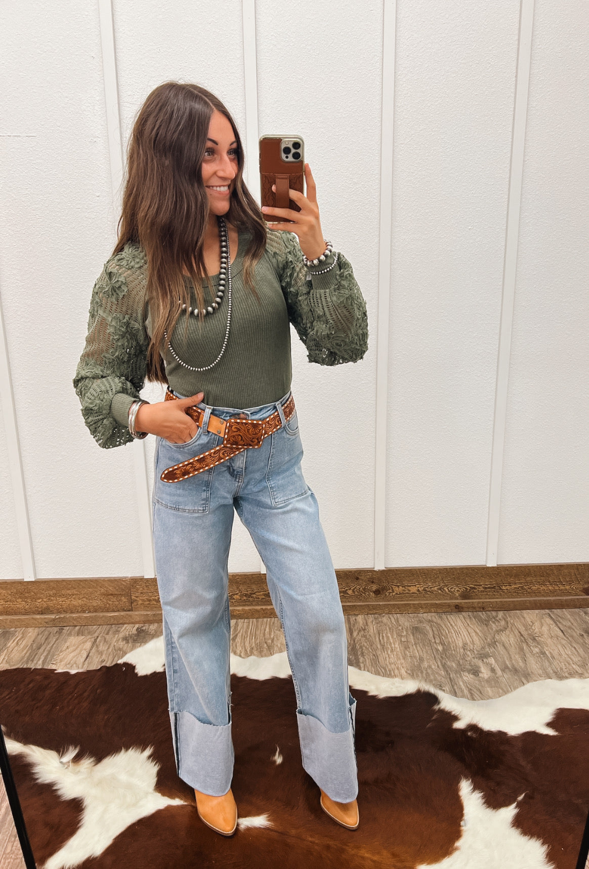Pair it with high-waisted light wash denim and a tooled leather belt for a western-chic vibe, or tuck it into a sleek midi skirt with boots for a more dressed-up, romantic look.