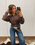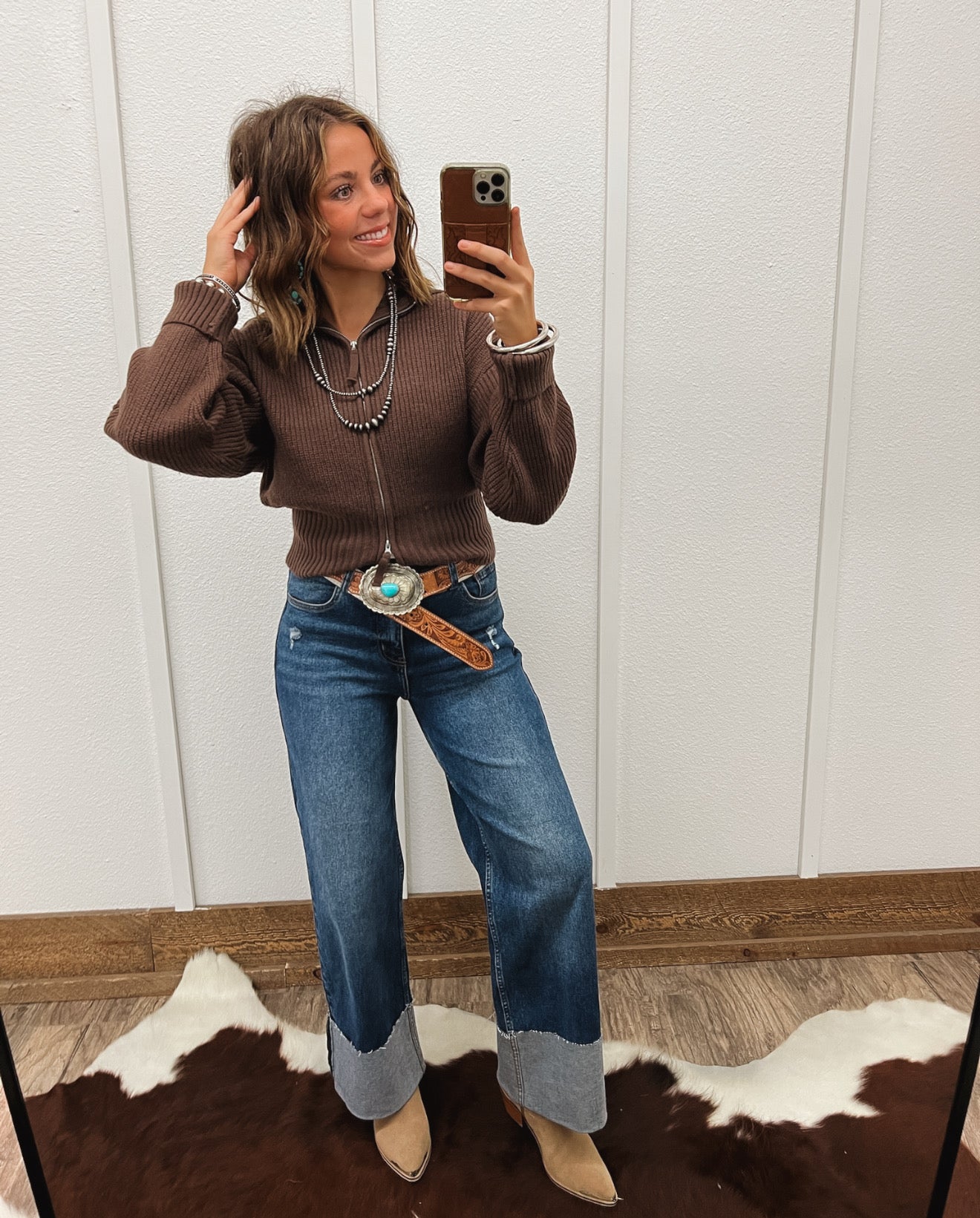 The Collared Zip-Up Sweater is where cozy meets cool with a touch of modern western edge. Featuring a ribbed knit texture, chic collar, and functional two-way zipper, it’s the perfect blend of comfort and versatility. Dress it up or down, this sweater is a closet essential you’ll keep reaching for.
