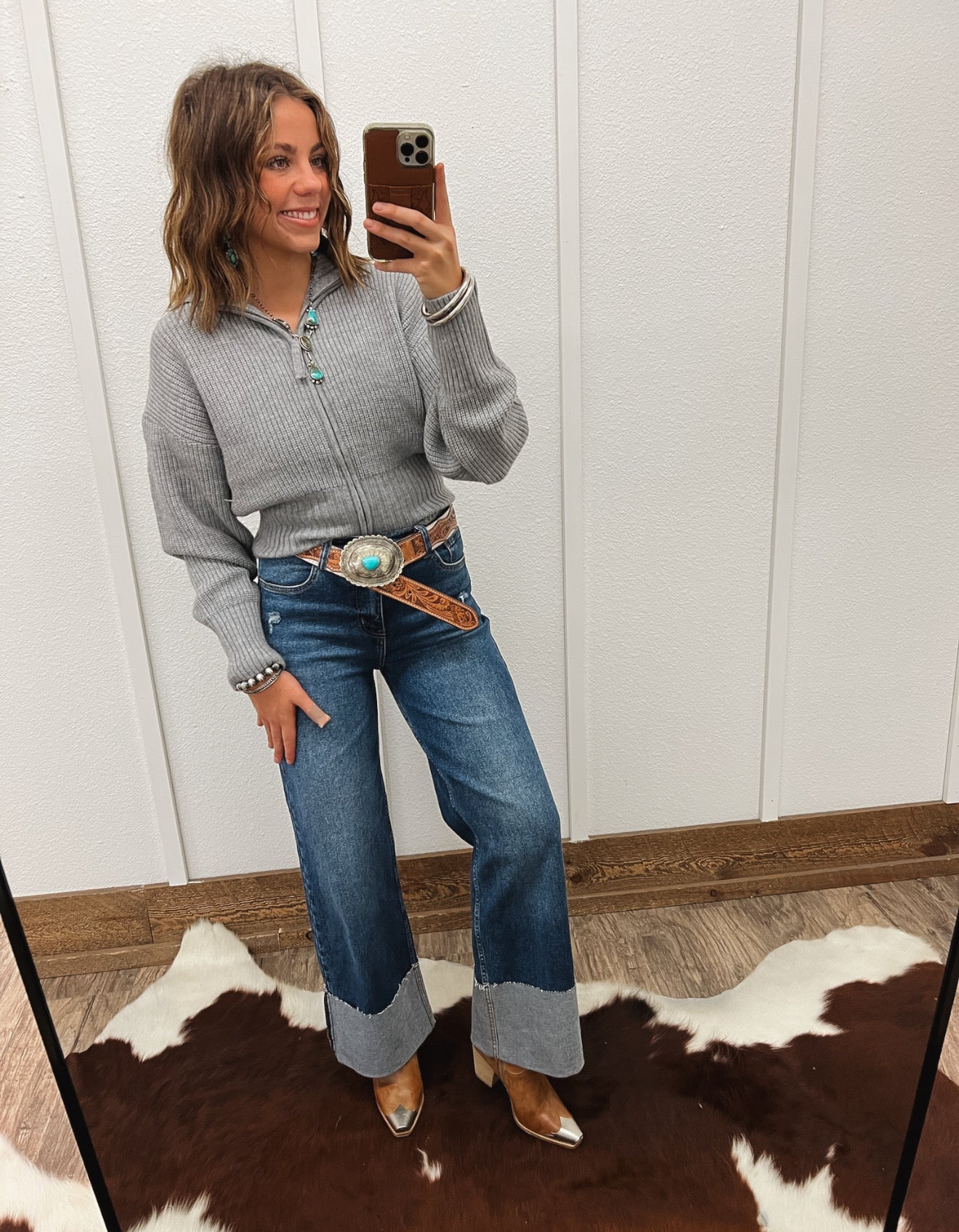 The Collared Zip-Up Sweater is where cozy meets cool with a touch of modern western edge. Featuring a ribbed knit texture, chic collar, and functional two-way zipper, it’s the perfect blend of comfort and versatility. Dress it up or down, this sweater is a closet essential you’ll keep reaching for.