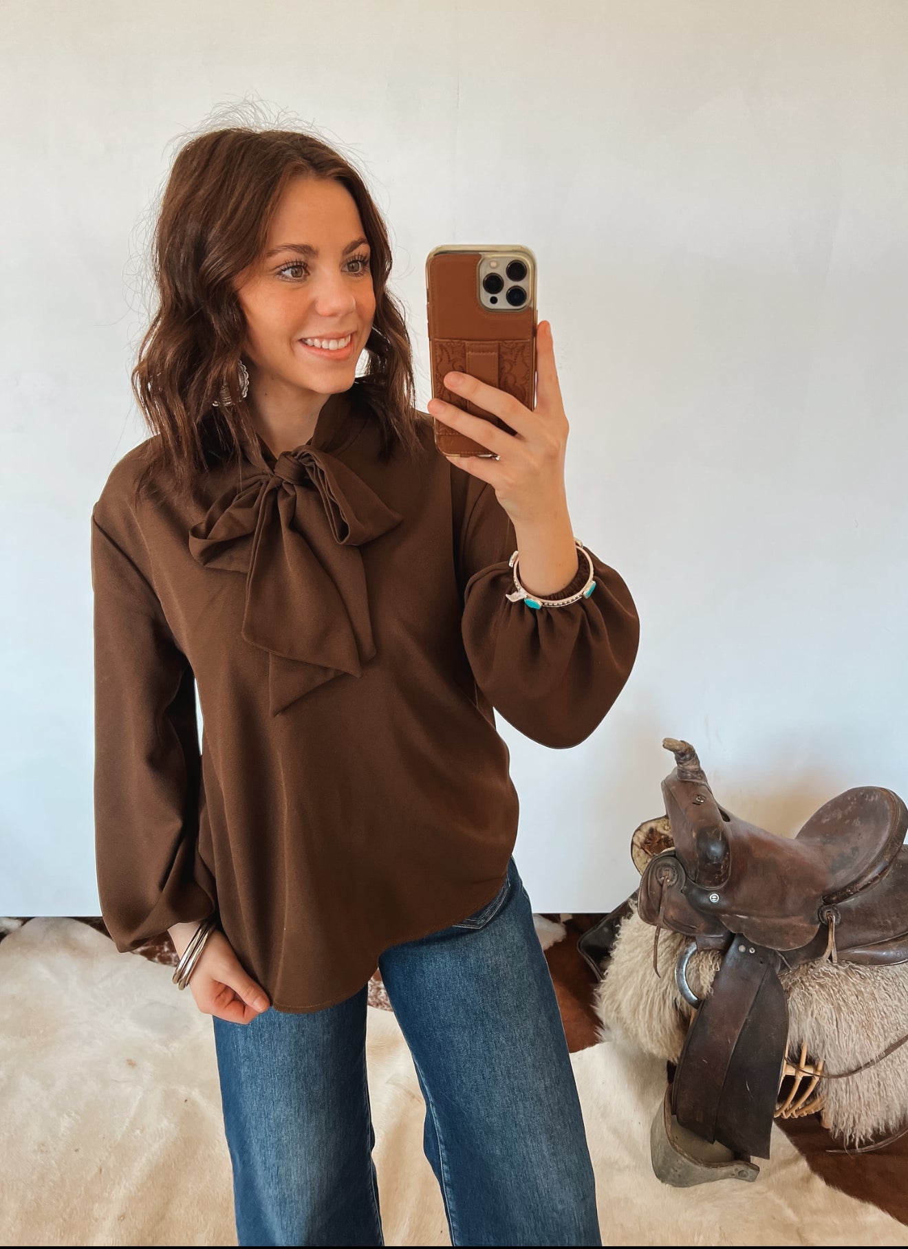Classic with a western-chic twist, the Howdy Front Tie Blouse is an effortless staple you’ll reach for again and again. Designed with a round neckline and a soft self-tie detail, this blouse adds a touch of femininity while keeping the look polished. The long sleeves feature elastic cuffs for a comfortable, easy fit, and the smooth, stretchy fabric drapes beautifully for all-day wear. Perfect for pairing with denim and statement accessories, this top transitions seamlessly from casual days to dressed-up nights.