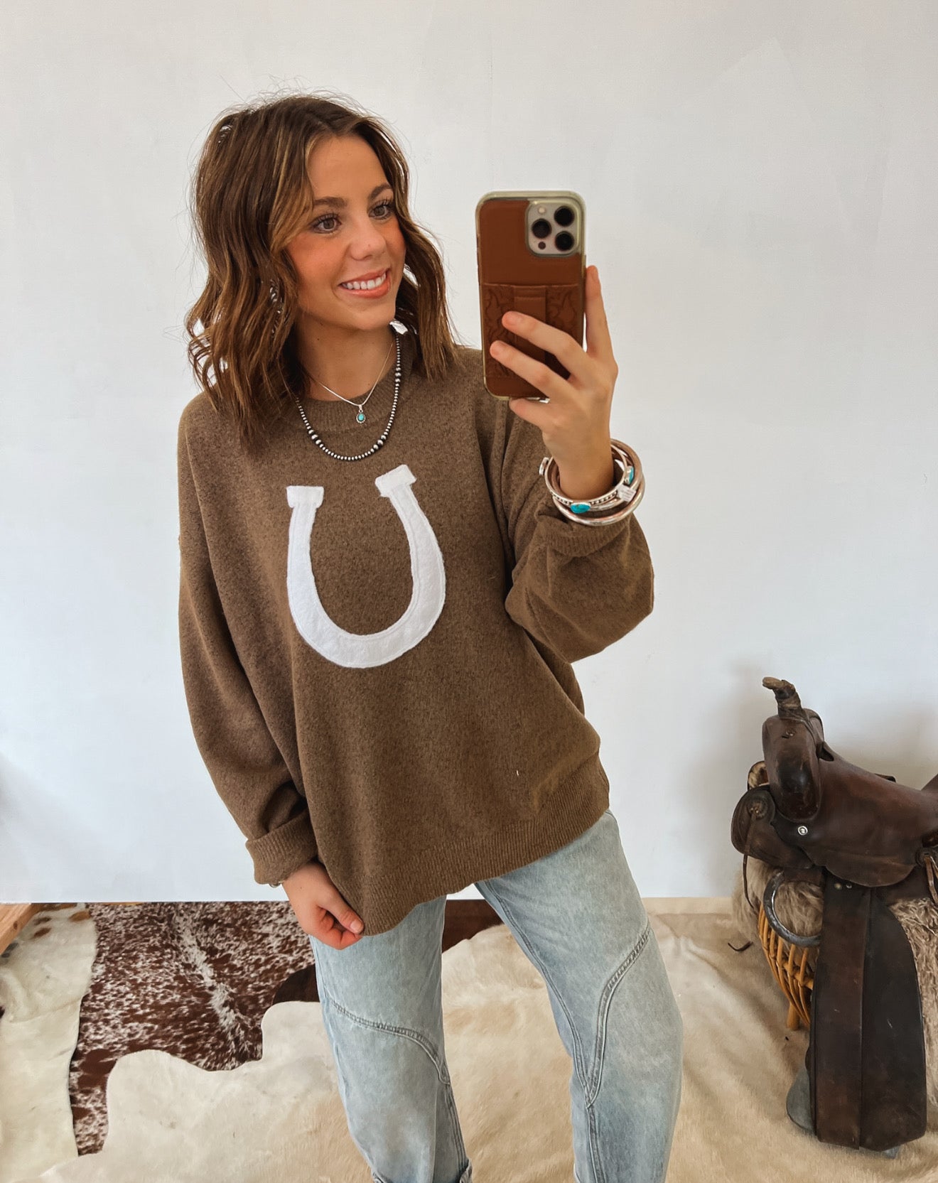 Bring a little luck everywhere you roam with the Luck Of The Cowboy Sweater in rich, earthy brown. Designed with an ultra-soft blend that feels cozy without the weight, this relaxed-fit sweater features a bold white horseshoe graphic front and center. The roomy sleeves, easy drape, and comfy stretch make it ideal for everyday wear, whether you're styling it with denim for a casual day out or layering it under a jacket for cooler weather.