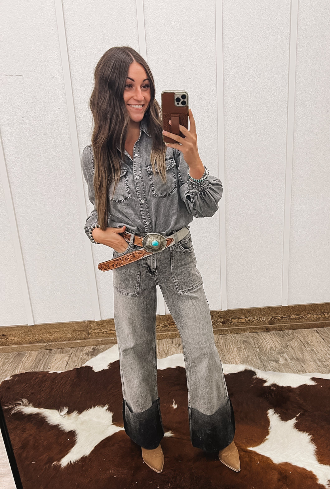 The Make Me Wanna Denim Pearl Snap is a classic western staple reimagined with modern comfort and effortless charm. Crafted from 100% tencel, this shirt has a soft, lightweight drape that moves with you, making it as easy to wear as it is eye-catching. With its pearl snap closures and timeless denim wash, it’s a go-to piece for layering or wearing on its own.