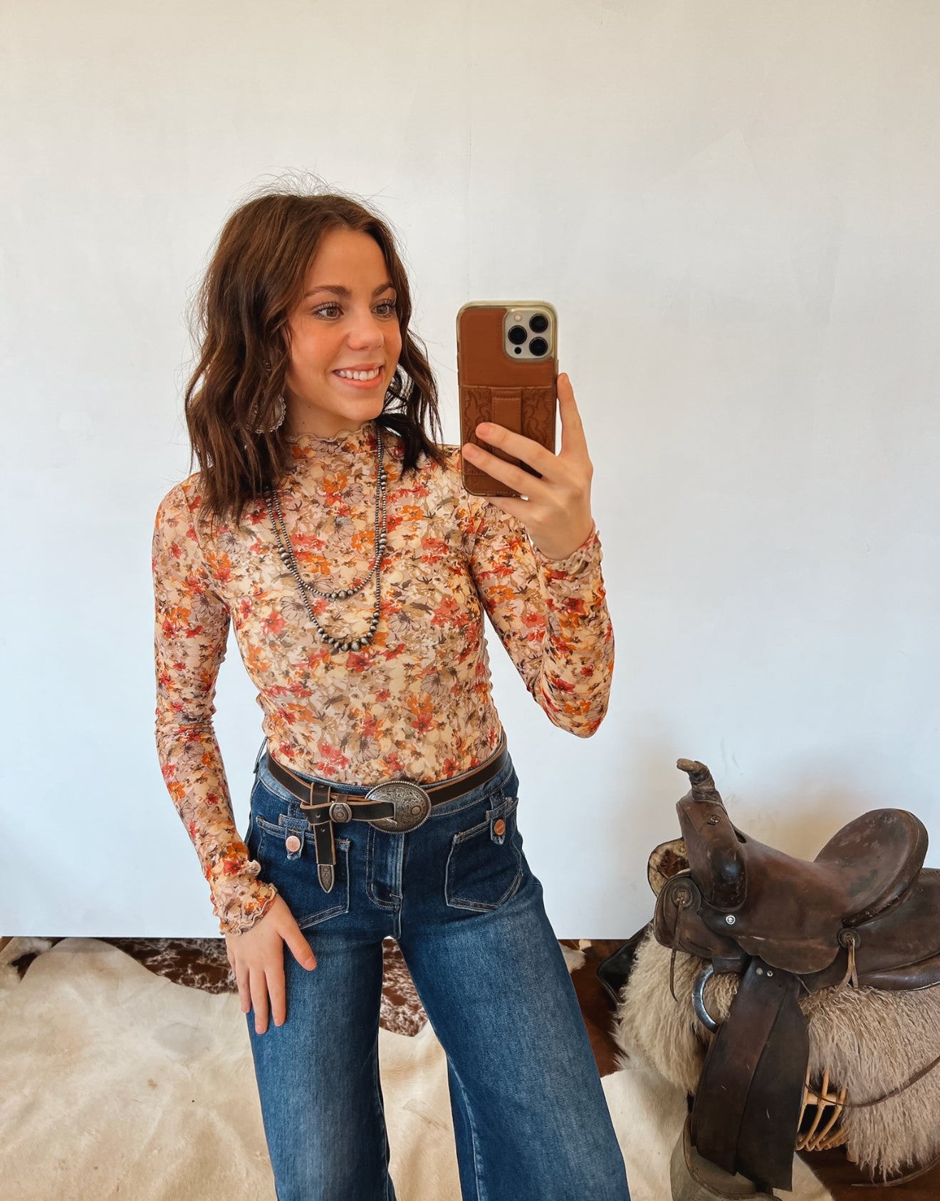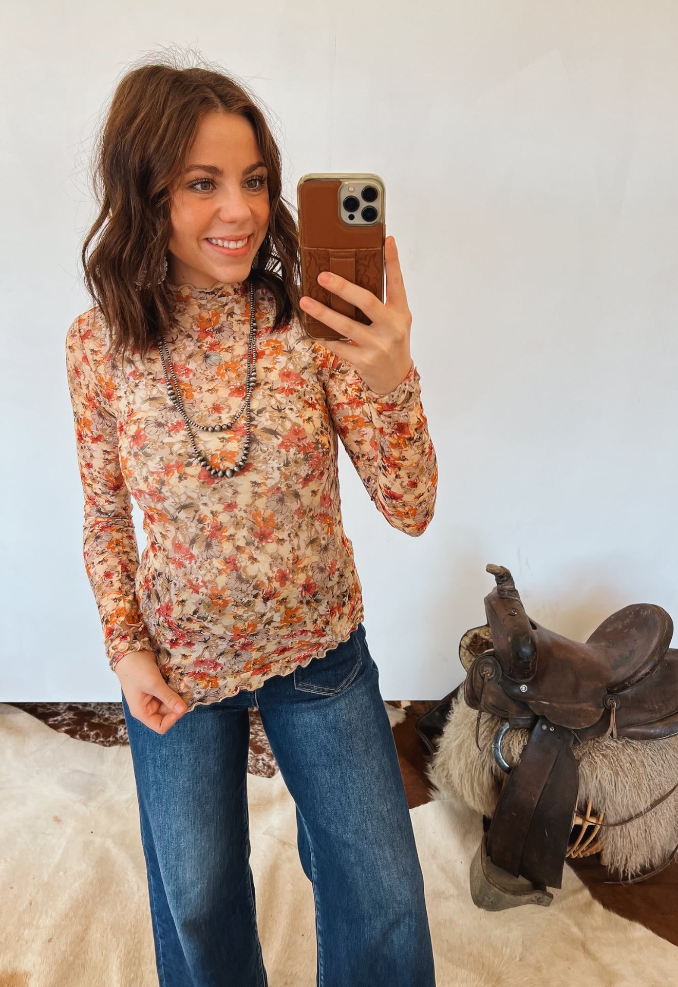 A feminine and flattering floral mesh top that’s perfect for layering or wearing on its own. Designed with a sleek mock neckline and soft stretch fabric, this piece adds effortless charm to any western or everyday look.
