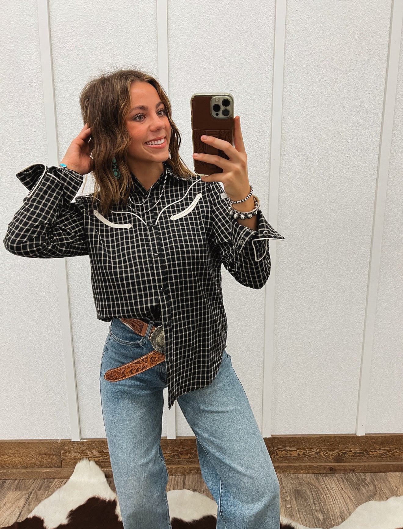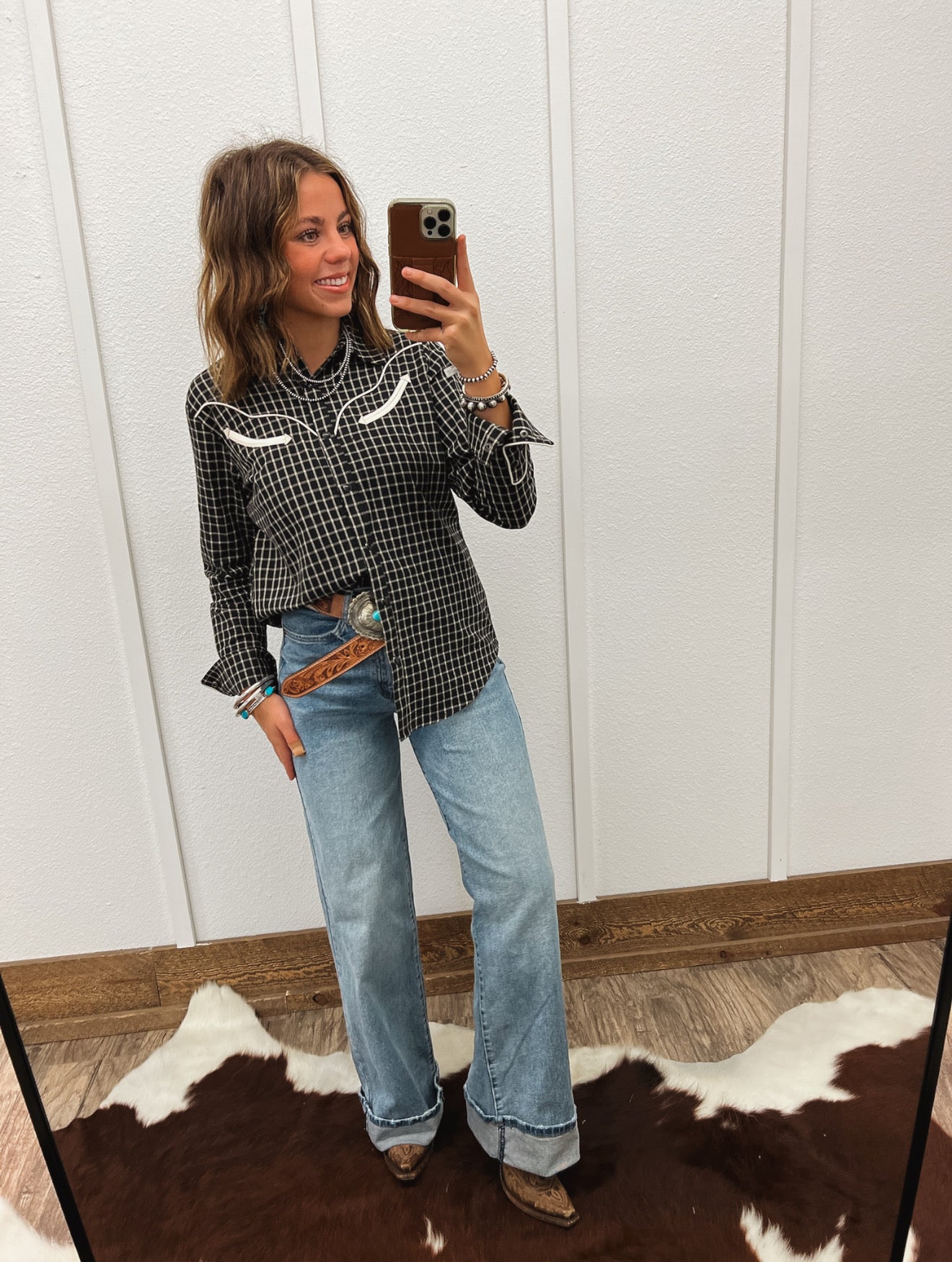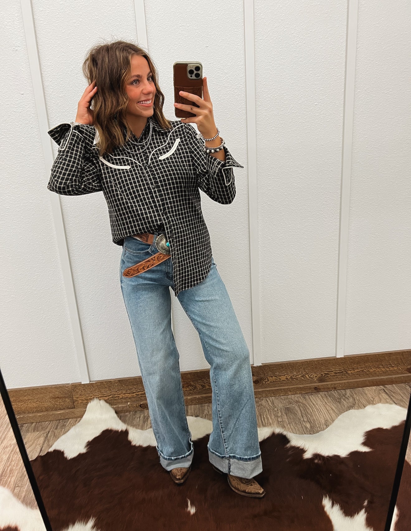 The Take Me Back Pearl Snap is a timeless nod to classic western style. With its bold checkered print and pearl snap closures, this shirt blends rugged authenticity with effortless wearability. The crisp cotton fabric makes it breathable and durable, while the western yoke and detailing add just the right touch of cowboy charm.