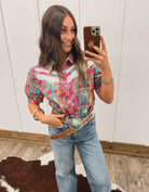 Bring playful western vibes to your wardrobe with the Rodeo Check Puff Sleeve Top. Featuring a bold checkered print with cowgirl-inspired silhouettes and a pop of white lace trim across the yoke, this shirt blends classic charm with standout style. The puff sleeves add a feminine touch while the button-down front keeps it versatile for both casual and dressy looks.