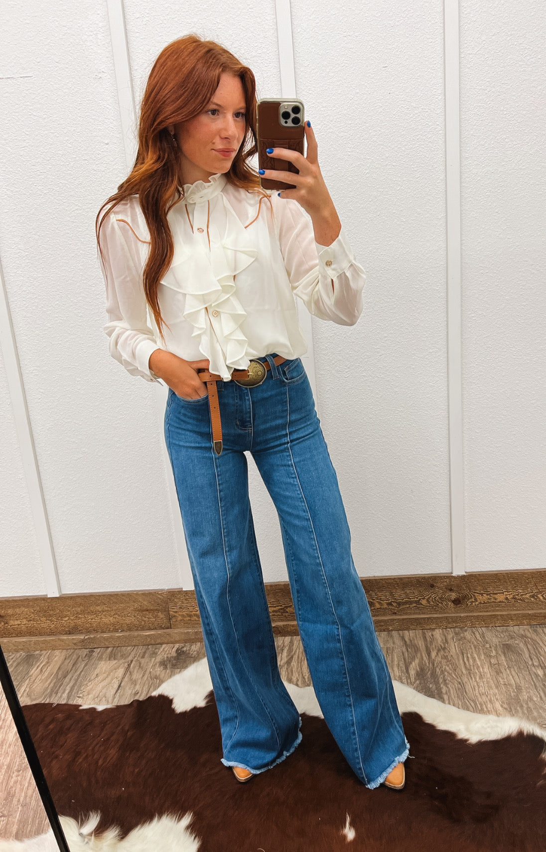 The Country Boy's Dream Ruffle Blouse brings timeless western sophistication with a feminine twist. Crafted from lightweight polyester, this blouse features a dramatic ruffle front and high neckline that exudes vintage-inspired charm. Delicate piping details frame the shoulders, while its semi-sheer finish adds a subtle touch of romance.