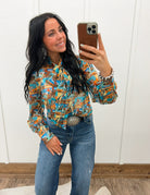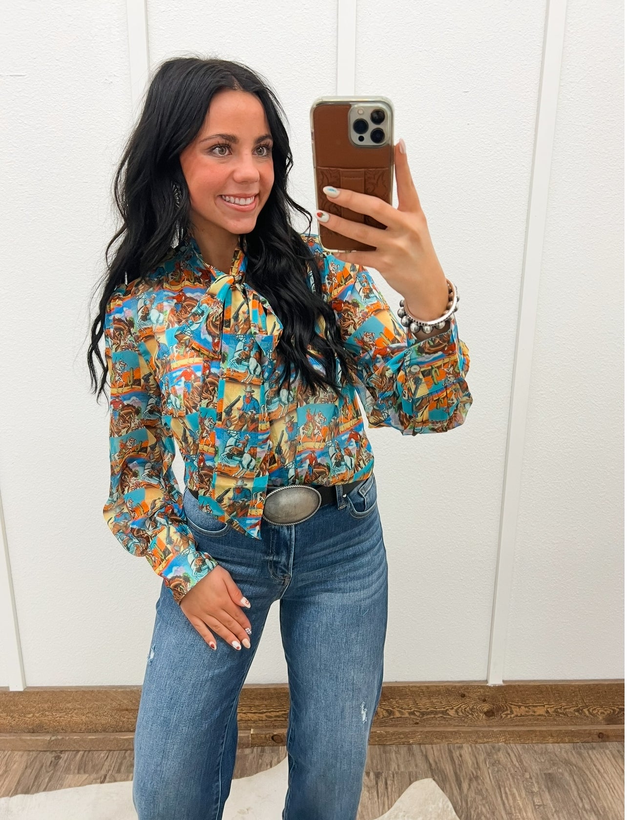 Make a statement with the Vintage Cowboy Sheer Blouse—a colorful tribute to the wild west with an effortlessly feminine twist. Featuring a vibrant collage of cowboy scenes and a lightweight, semi-sheer fabric, this blouse blends nostalgia with high-style flair. Finished with a self-tie neckline and voluminous long sleeves with gathered cuffs, it’s perfect for dressing up your denim or adding western edge to workwear.