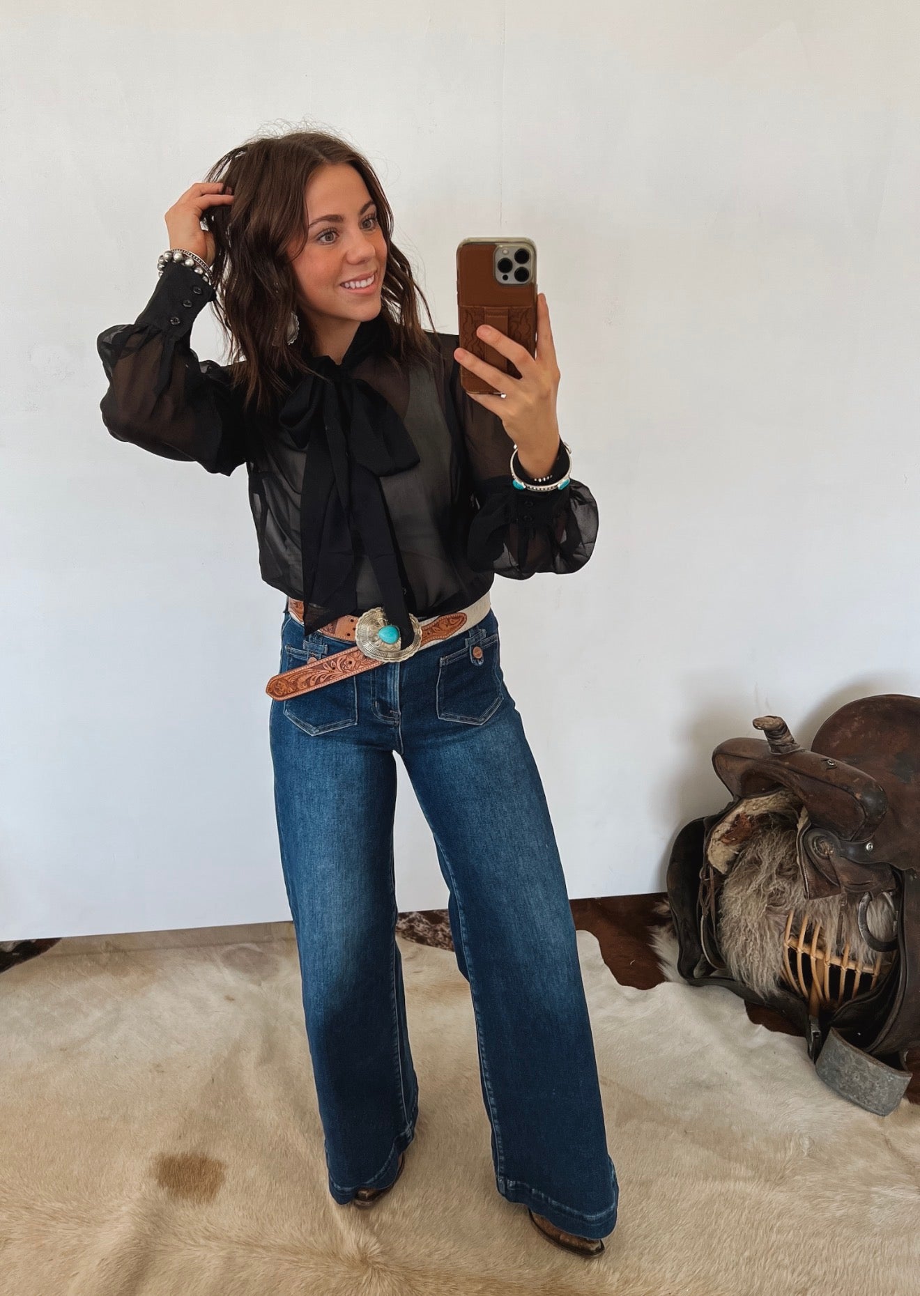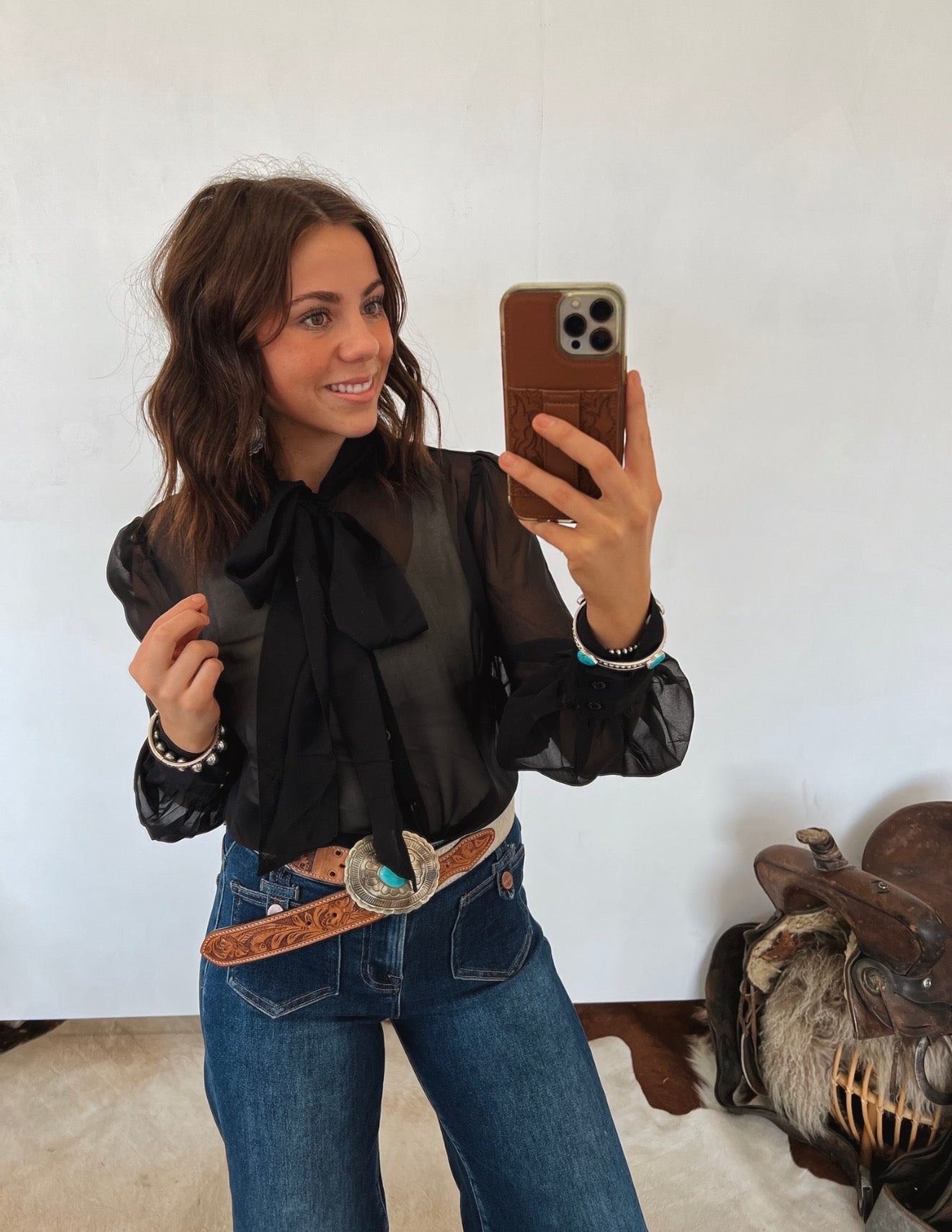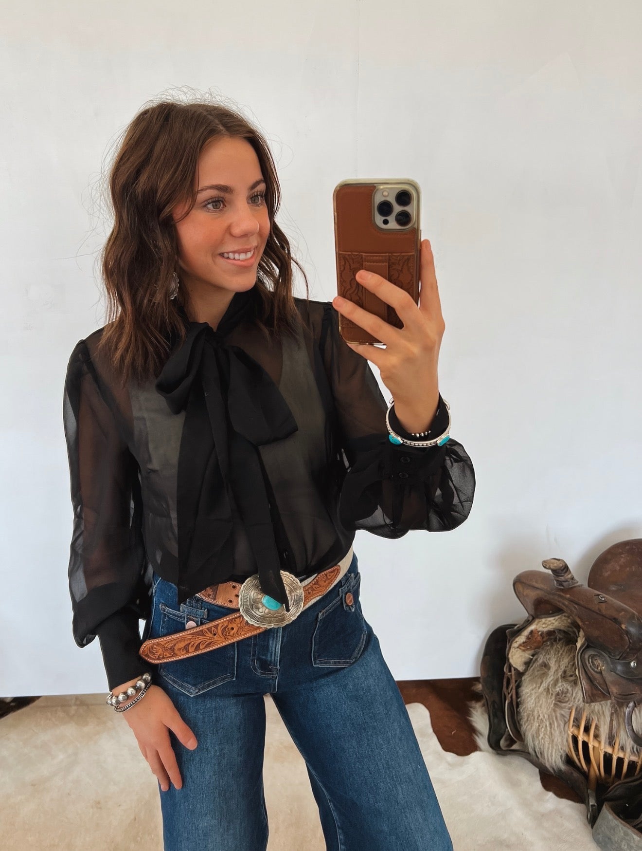 Be My Baby Sheer Front Tie Blouse — a romantic, statement-making piece designed to add effortless elegance to any look. Crafted from lightweight sheer fabric, this blouse features a soft front tie neckline, flowing long sleeves, and a delicate, airy silhouette that feels both feminine and elevated. Perfect for layering or dressing up for evening plans, it’s a timeless piece with just the right amount of drama.