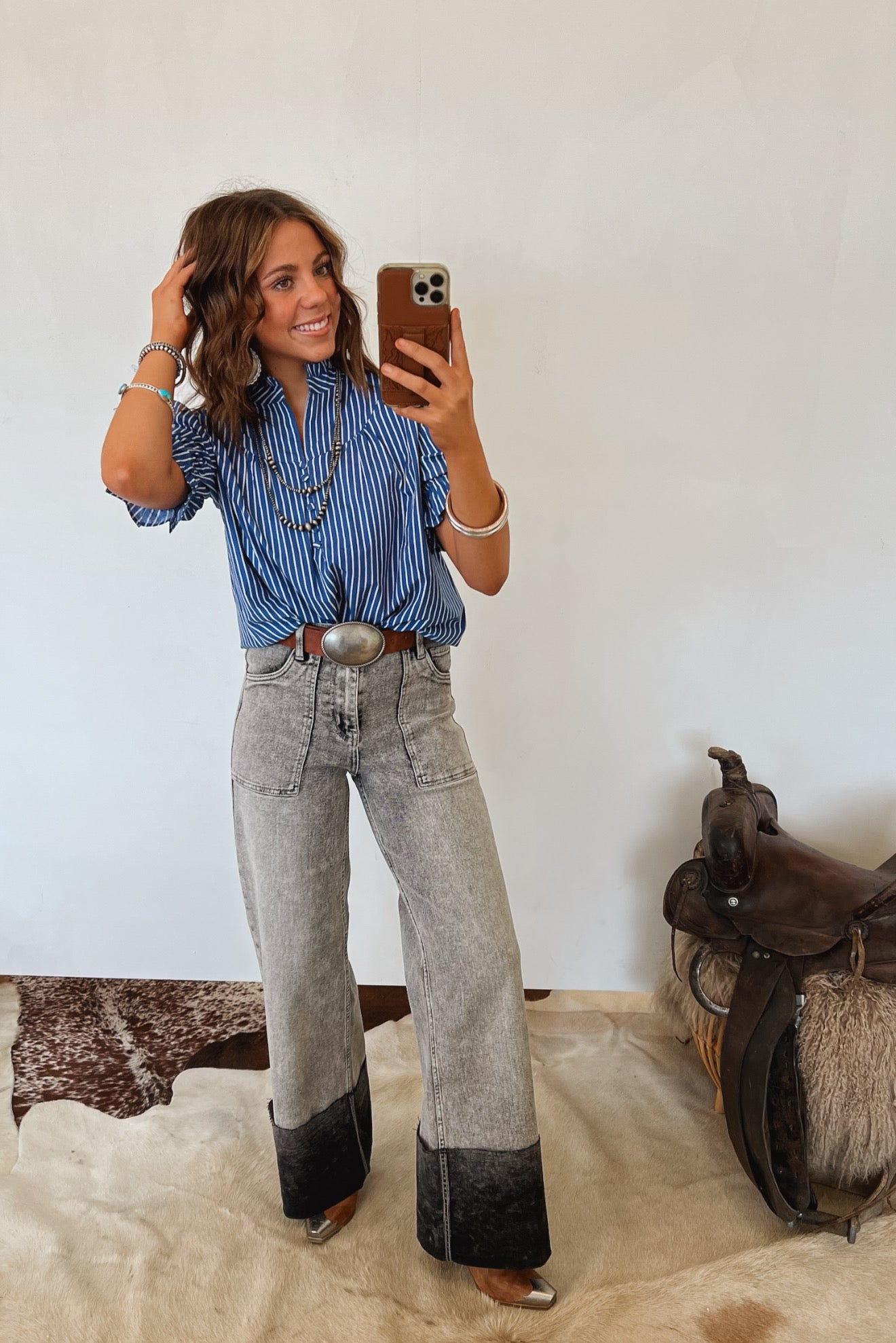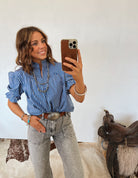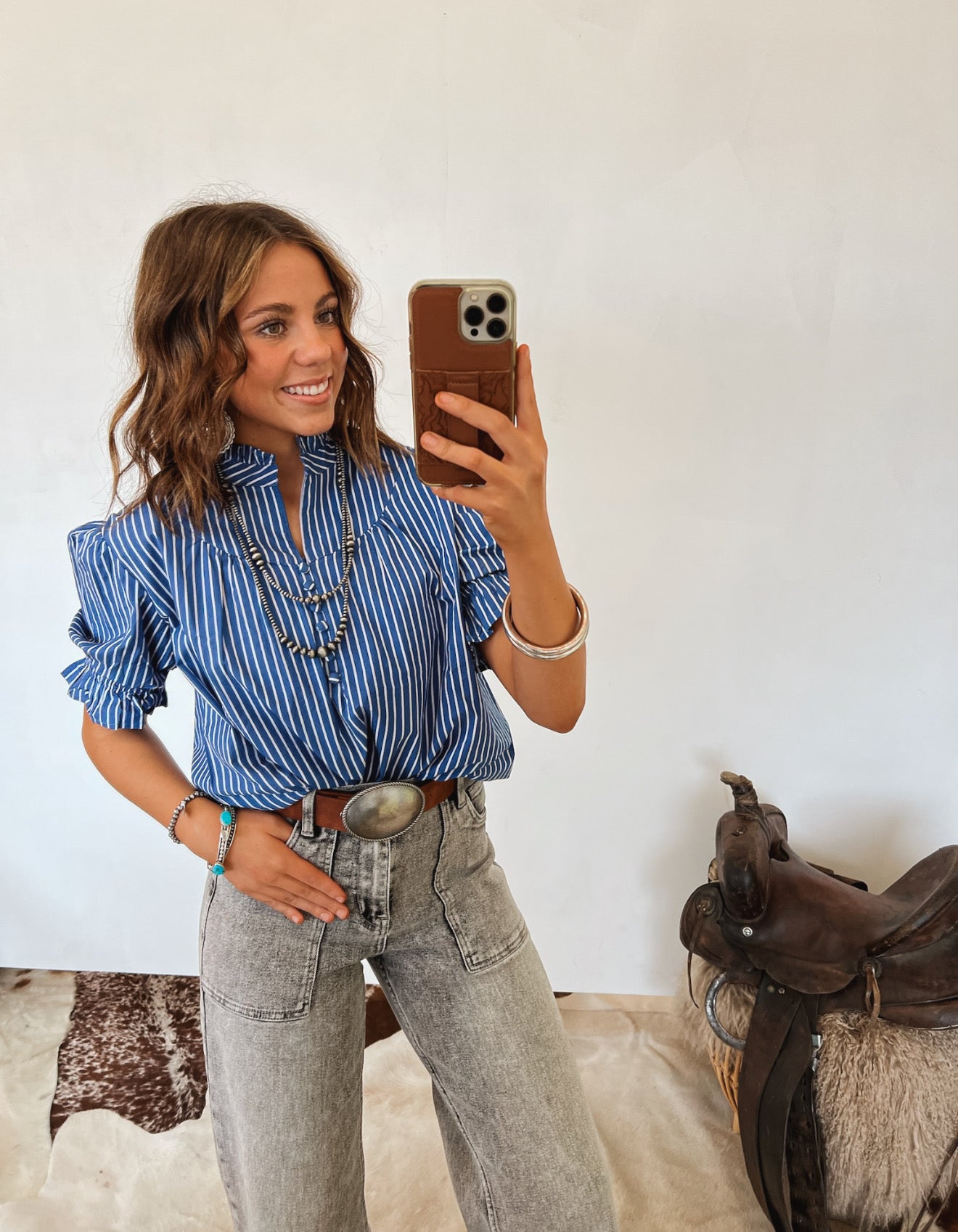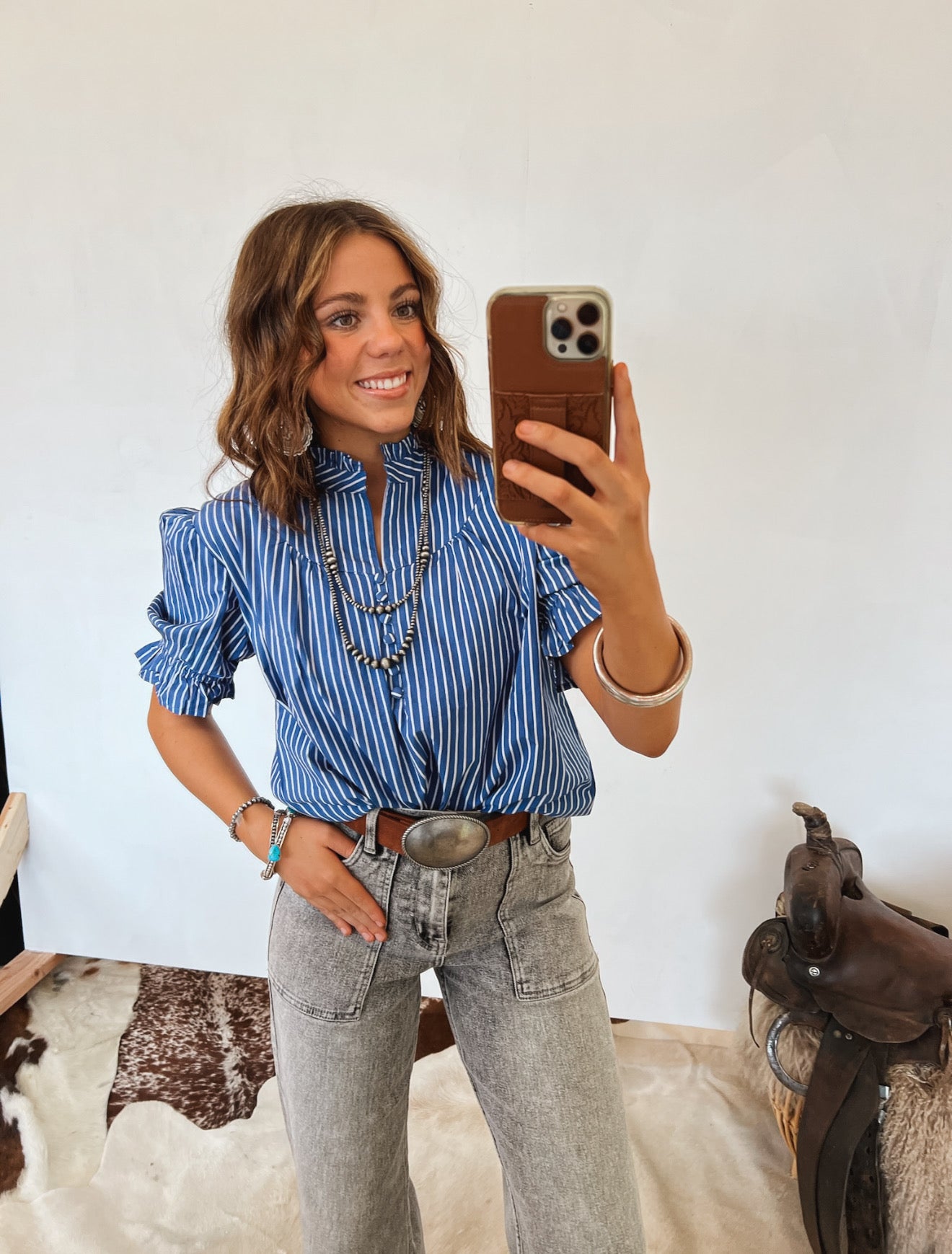 Classic with a western twist, the Stacey Striped Top brings timeless charm to any outfit. Made from 100% cotton, this lightweight blouse features bold vertical stripes, a subtle ruffle mock neckline, and puffed sleeves with gathered cuffs for a feminine touch. Its relaxed fit makes it easy to tuck into your favorite jeans or skirts for that effortlessly polished cowgirl look.