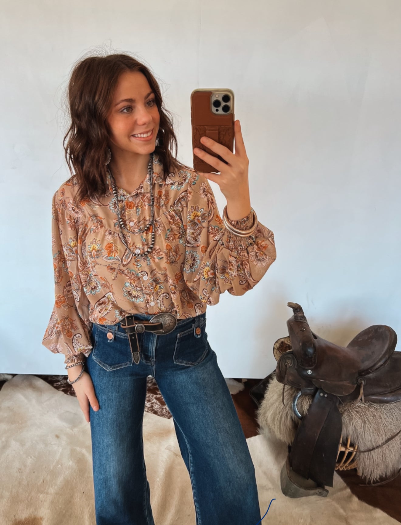 Bring easy elegance to your everyday wardrobe with the Sweet Home Paisley Blouse. Featuring a soft, flowing silhouette and an allover paisley print in warm, earthy tones, this blouse is effortlessly flattering and endlessly versatile. The lightweight fabric drapes beautifully, while the classic button-front design and collared neckline keep the look polished yet relaxed. Finished with subtle gathering and elasticized cuffs, it’s perfect for dressing up denim or pairing with trousers for a refined, boho-inspired vibe.