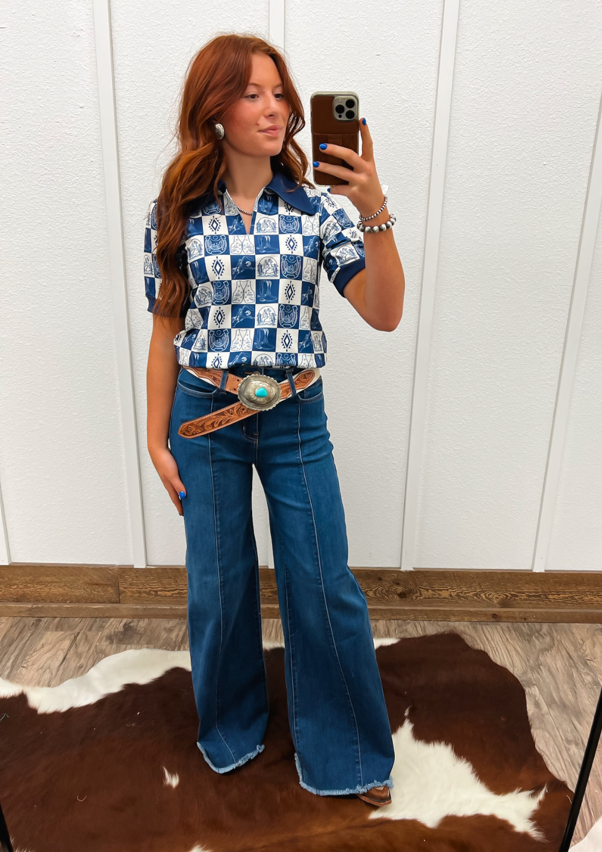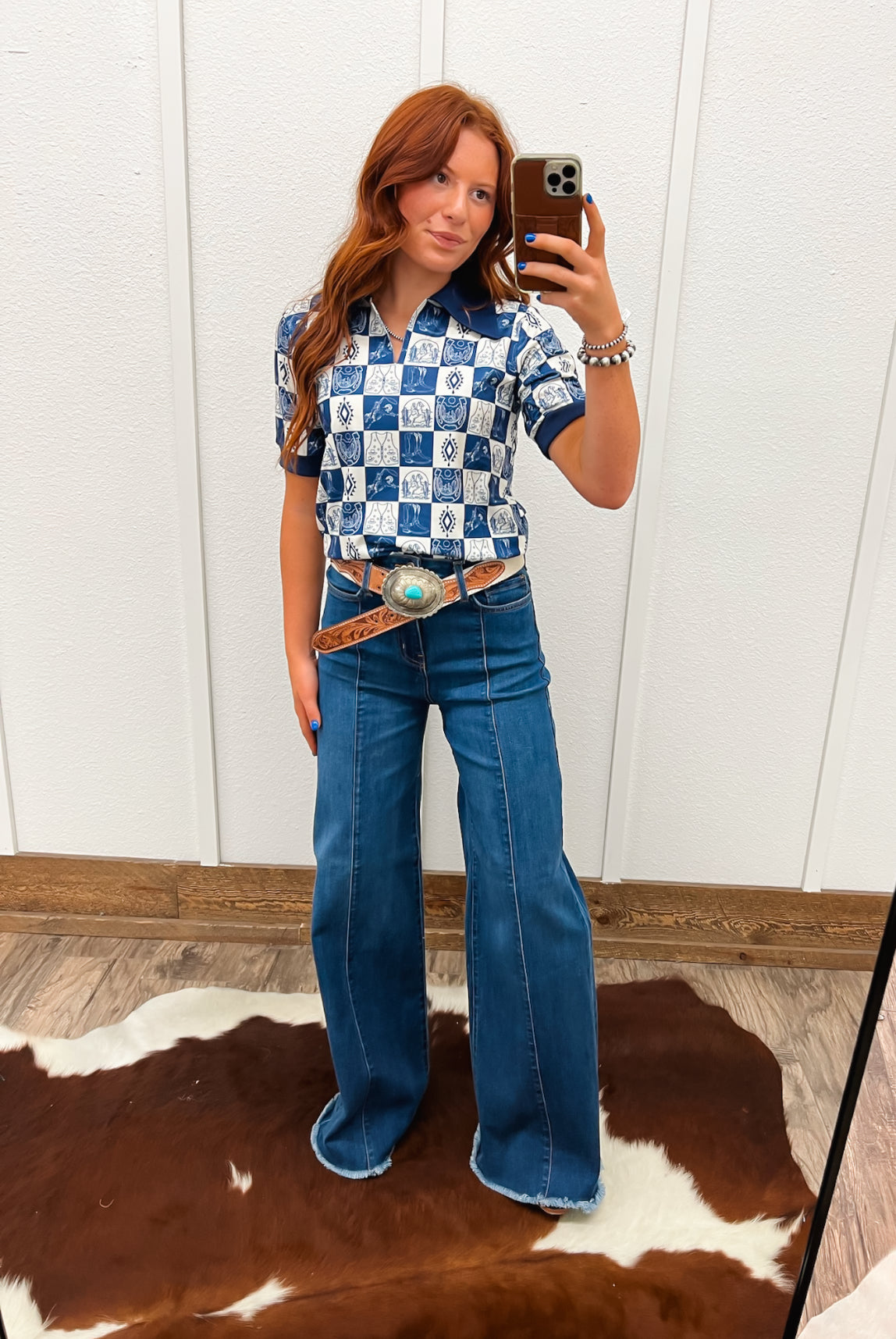 The Rodeo Check Polo Top mixes classic western charm with a sporty twist. Featuring a bold blue-and-cream checkerboard print with cowboy-inspired graphics, this collared short sleeve is both playful and polished. The soft stretch fabric keeps it comfy while the ribbed hem and cuffs add a tailored finish.