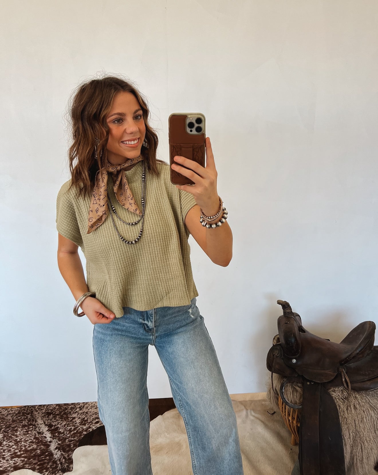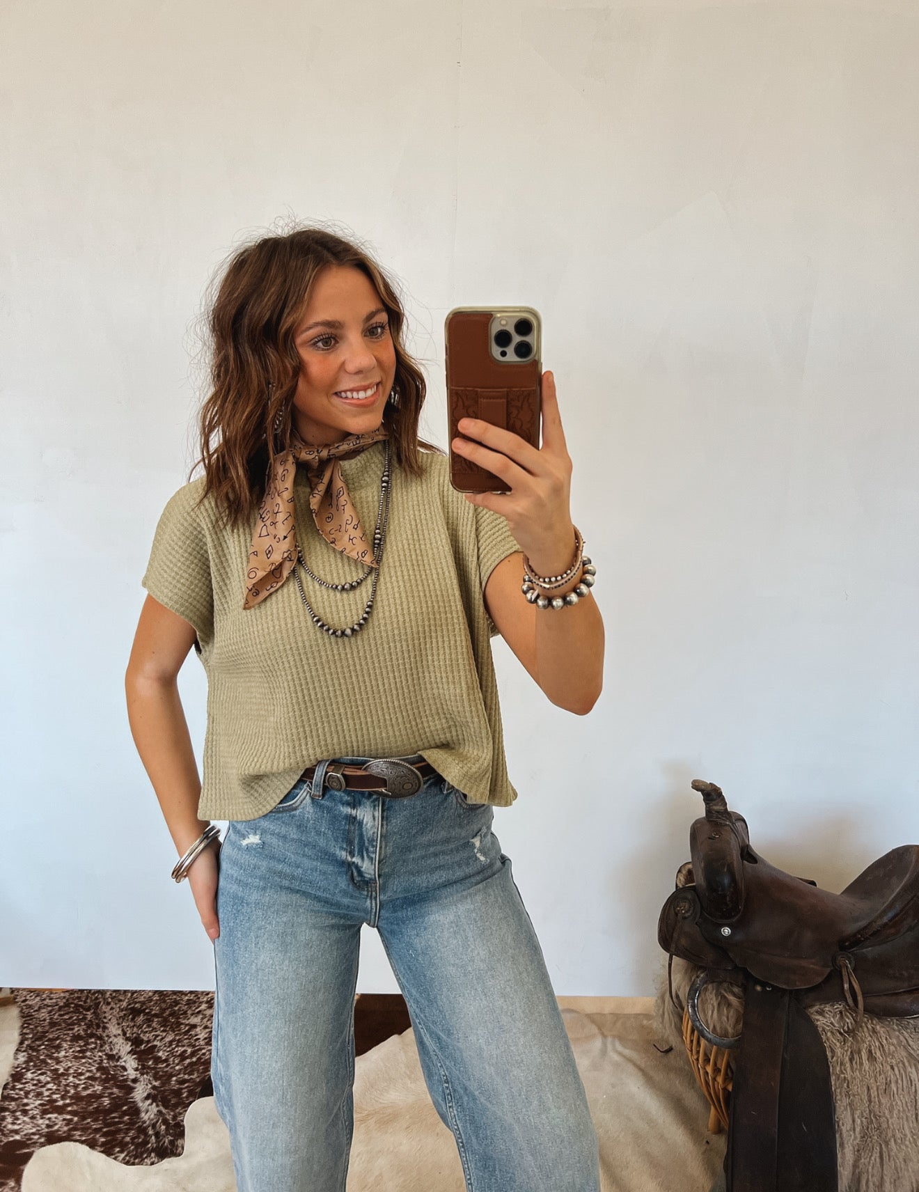 Effortless, airy, and perfectly cozy — the Waffle Knit Mock Neck Top is your new go-to for easy everyday styling. Designed with a soft, breathable waffle texture, this top brings that relaxed western-casual vibe while keeping things polished and put-together.