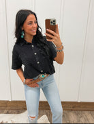 Embrace your inner cowgirl with the Wanna Be Button Up Top. This stunning top features two front pockets and silver buttons, perfect for those warm summer days. Show off your western style and stay cool and comfortable all season long.