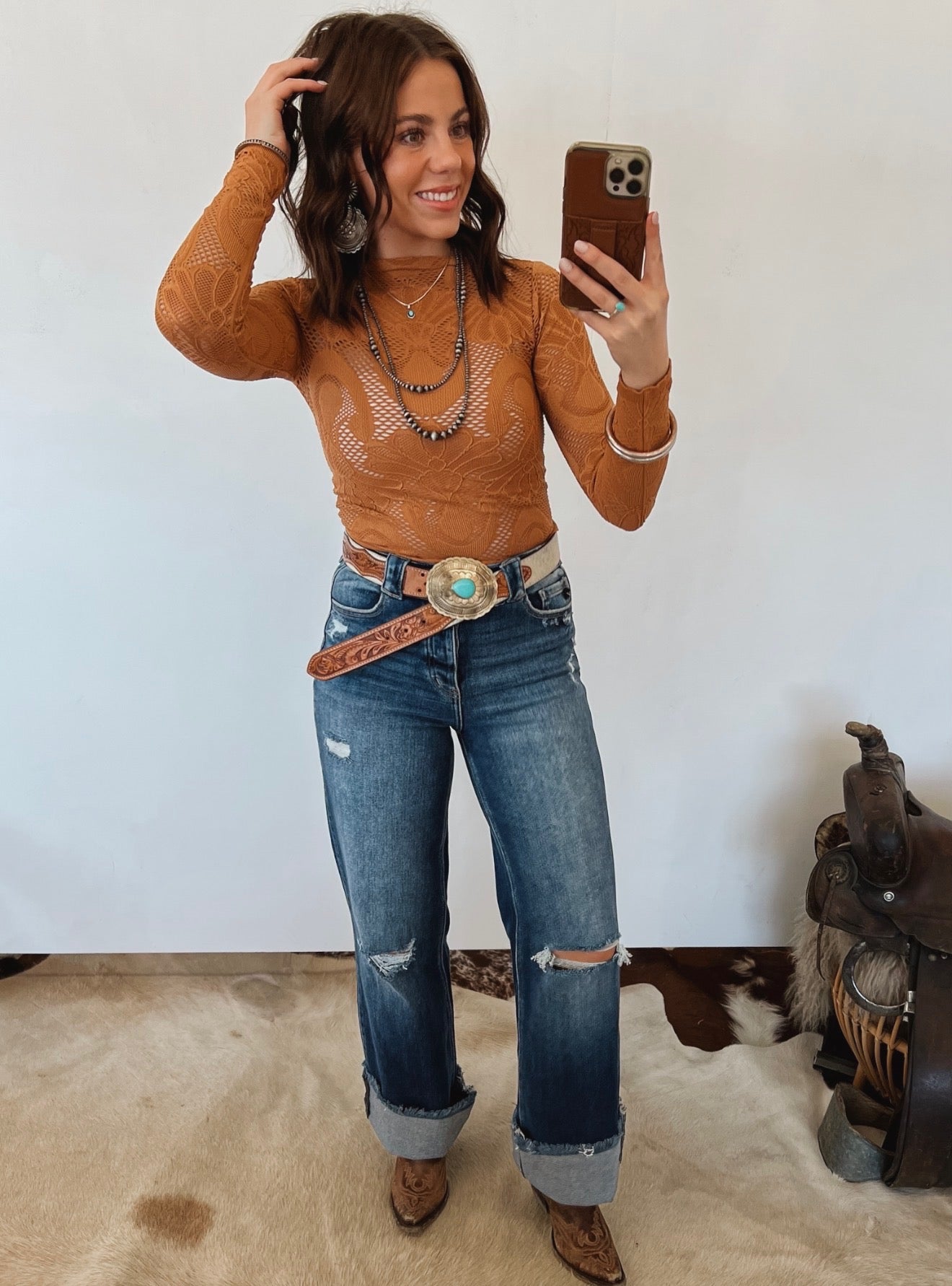 Layer over a bralette or tank and pair with high-rise denim and silver jewelry for a bold, rodeo-ready look. For colder weather, throw on a leather jacket or blazer to keep the western vibe sharp and modern.