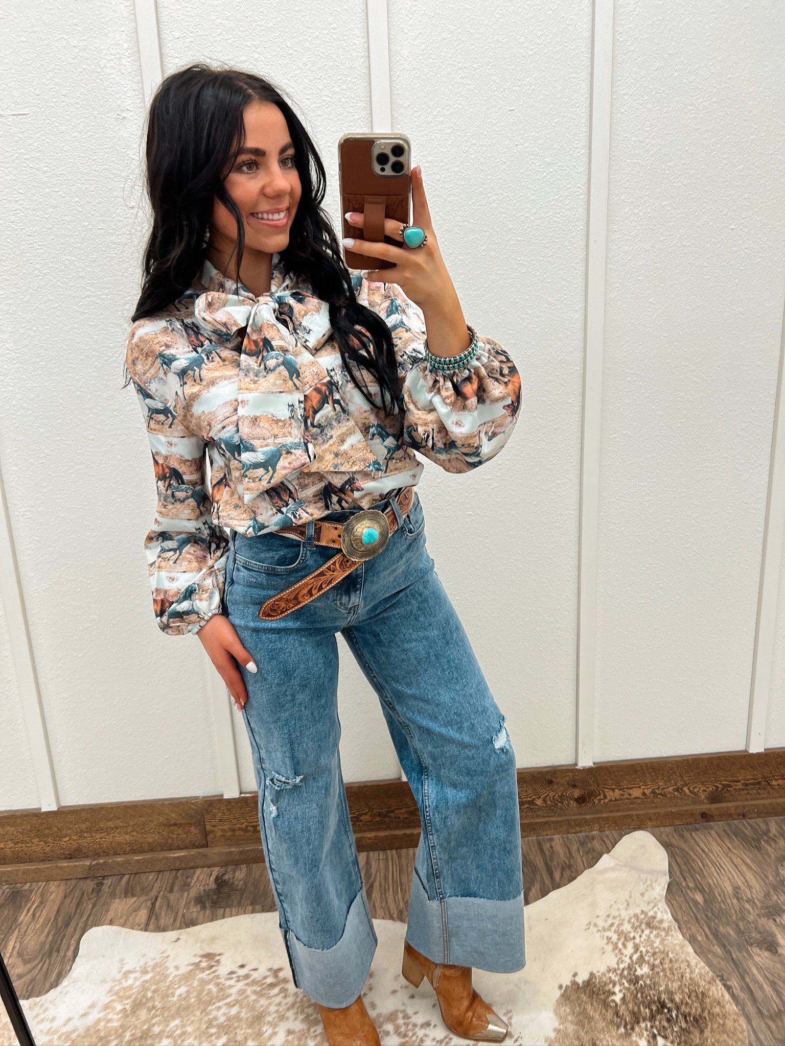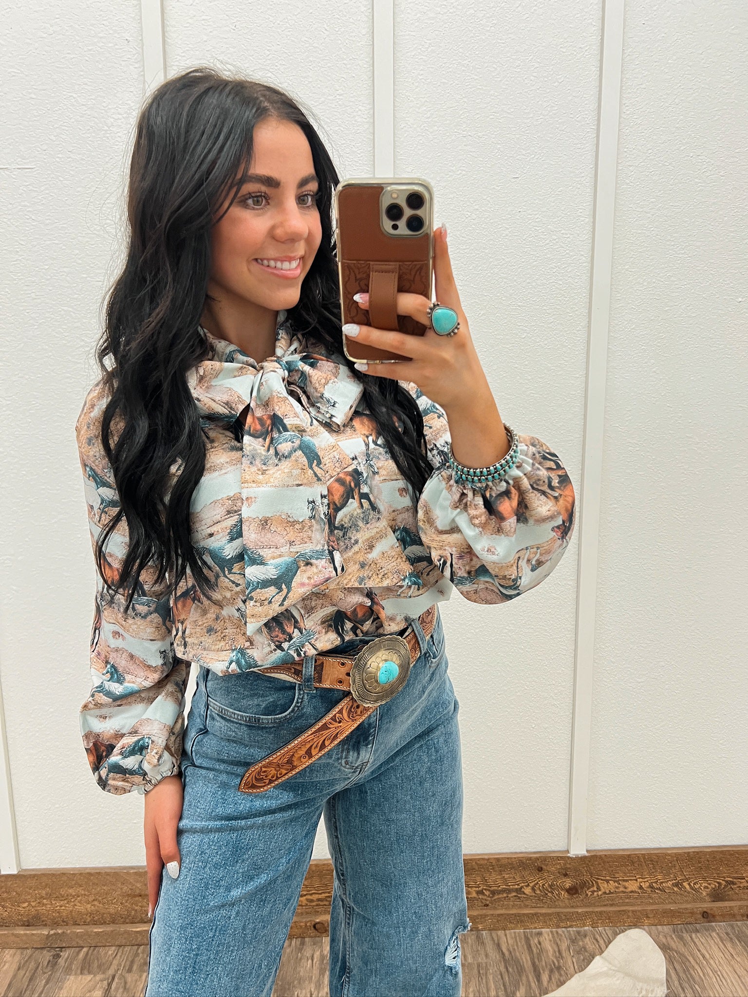 Saddle up in style with our Wild Horse Roam Front Tie Blouse. Featuring a beautiful horse print and a flattering front tie, this blouse is perfect for any cowgirl looking to add some western charm to her wardrobe. Made with high-quality materials for all-day comfort on the range.